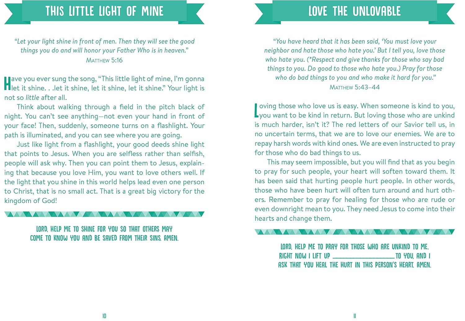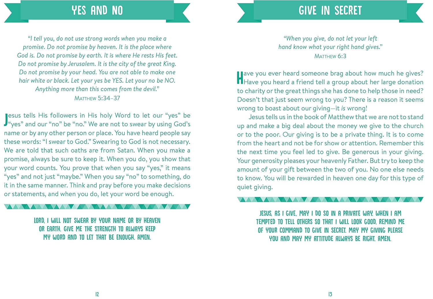 This deeply encouraging devotional is inspired by the words of Jesus in the New Testament. From His teaching and preaching to Jesus' miracles and parables, the kids in your life will read the life-changing, memorable words of Christ alongside a relevant devotion guaranteed to motivate and challenge them to grow in their faith. 180 devotions touch on important life themes including: "You are the light of the world. You cannot hide a city that is on a mountain" (Matthew 5:14) and "Pray for those who do bad things to you and who make it hard for you" (Matthew 5:44). Featuring kid-friendly scripture passages from the New Life Version of the Bible!