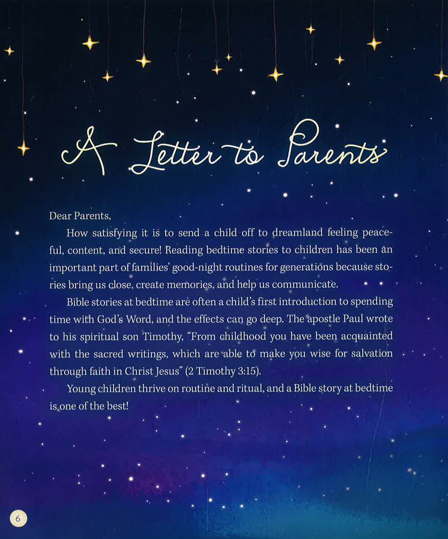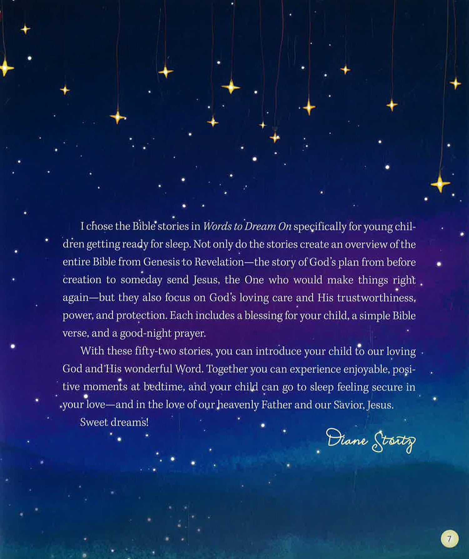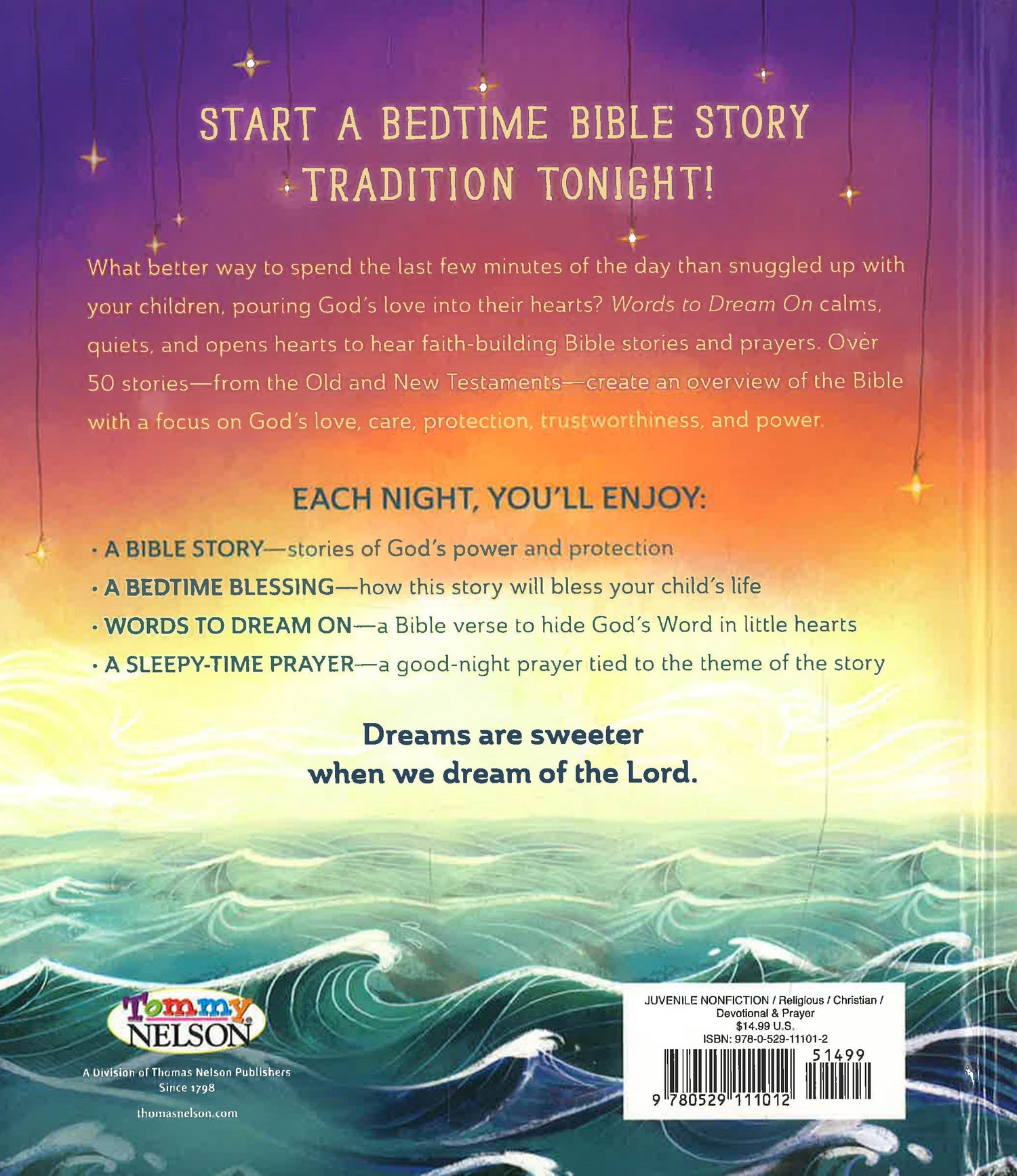 Start a bedtime Bible story tradition with your little ones tonight!Young children thrive on routine and rituals, and a Bible story at bedtime is one of the best routines to establish! A combination Bible storybook and book of prayers, Words to Dream On is the perfect bedtime storybook for young children, with a "once upon a time" voice that is also true to God's Word. Over 50 stories-from the Old and New Testaments-create an overview of the entire story arc of the Bible. Stories are selected and retold for young children with a focus on God's love, care, protection, trustworthiness, and power.Each story includes an engaging title, a Bedtime Blessing (a short summary thought), Words to Dream On (a brief Bible verse), and a Sleepy-Time Prayer (a good-night prayer tied to the theme of the story). The book also includes a short letter to parents that includes tested ideas for establishing a good bedtime routine with young children and tips for reading aloud to children at bedtime.Trim Size: 6.875 x 8