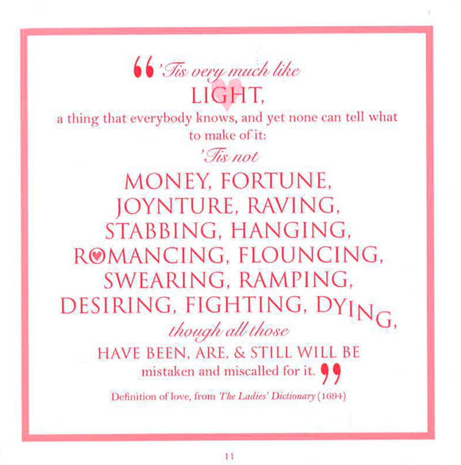 Love is perhaps the hardest emotion to put into words. With more than 70 quotations from poets and writers, this book is the answer. Whether you're suffering the pangs of first romance or declaring devotion to a lifelong partner, here is a treasure trove of inspiration. From the literary genius of Virgil and Shakespeare and Jane Austen's keen social commentary to snappy asides from contemporary writers and comedians such as Bill Crosby, it will allow everyone to find their own special way to say, "I love you." Among the dozens of quotations, sayings, and mottoes, you're sure to discover the perfect bon mot for the moment--there's something appropriate for every occasion on which you need to declare your affection. The book also makes a great gift for Valentine's Day.