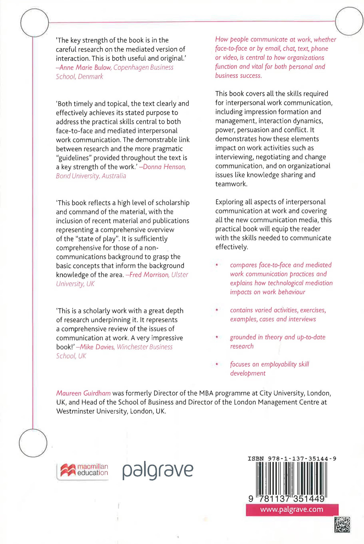 Explores all aspects of interpersonal communication at work, from face-to-face meetings to new forms of computer mediated communication such as social media. Will help the reader achieve skilled interpersonal communication at work through the understanding of relevant theory and latest research, made clear in non-technical language with examples.