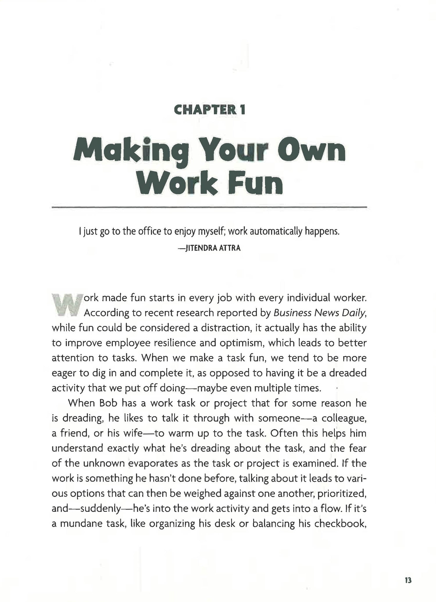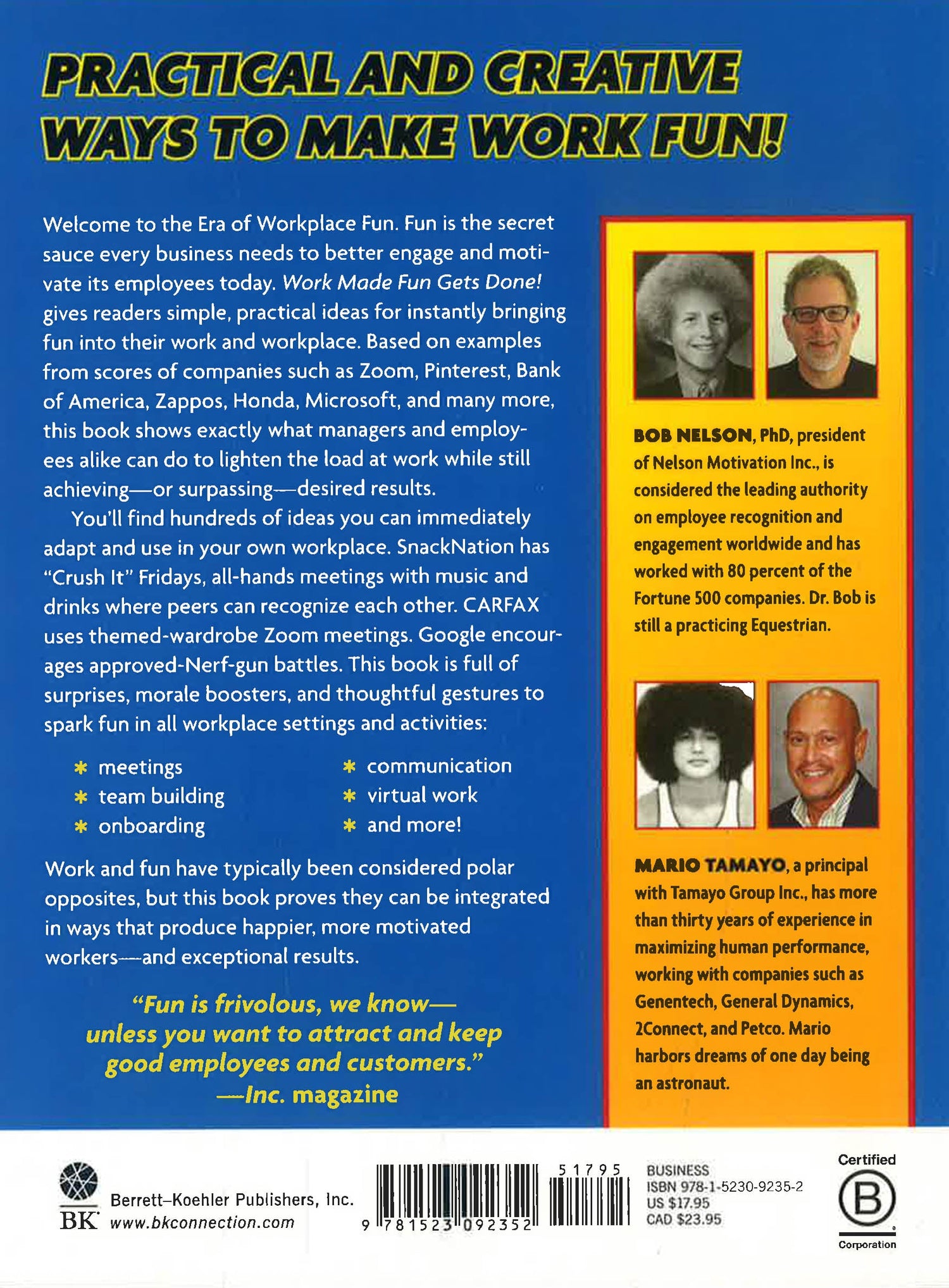 Fun is the secret sauce every business needs to better engage and motivate its employees today. Work Made Fun Gets Done! gives readers simple, practical ideas for instantly bringing fun into their work and workplace. Based on examples from scores of companies like Zoom, Pinterest, Bank of America, Zappos, Honda, Microsoft, and many more, this book provides clear examples of exactly what managers and employees alike can do to lighten the tone in the work environment and allow employees to have more fun at work.