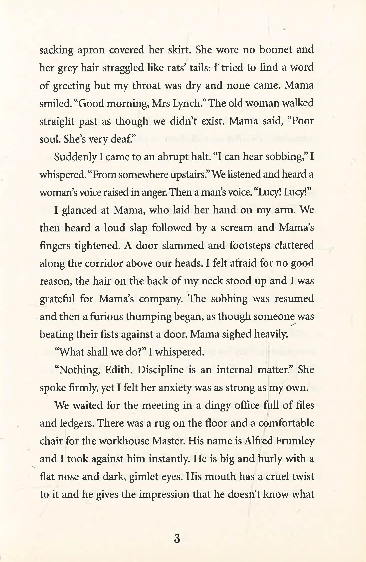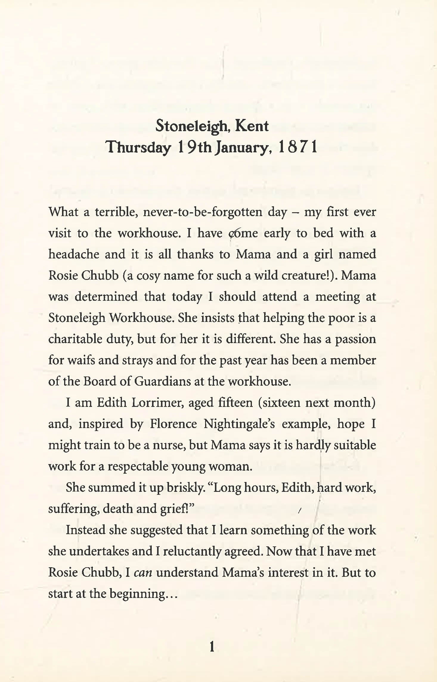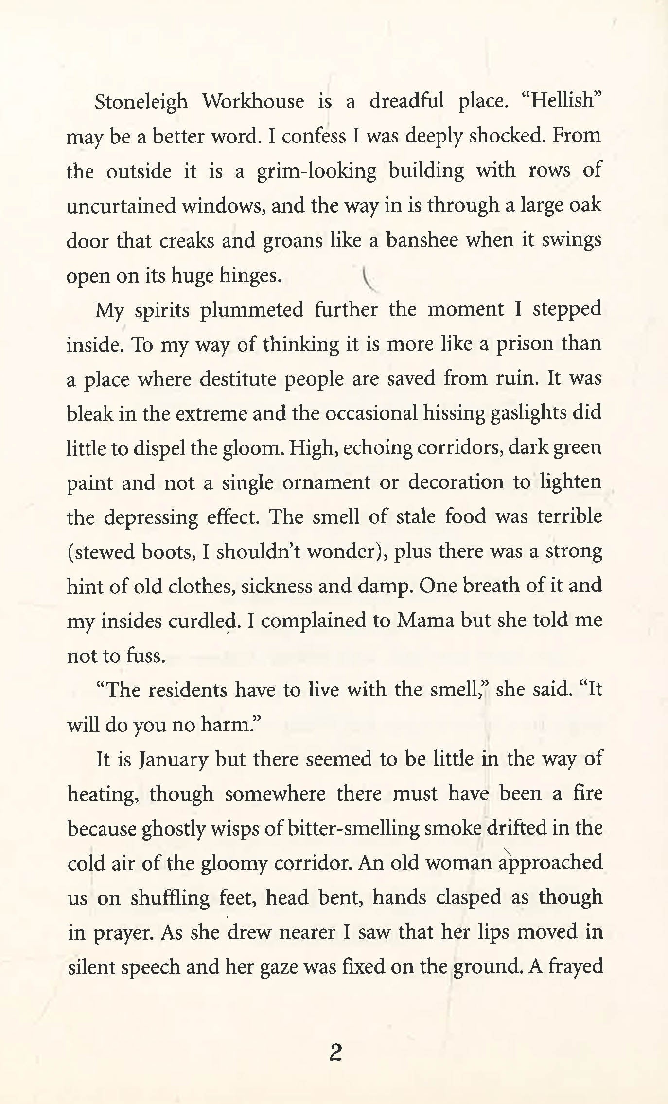 Workhouse is the gripping tale of a girl drawn into the world of a Victorian workhouse. It's January 1871 when Edith, the sheltered daughter of a wealthy widow, pays her first eventful visit to the workhouse for the poor. There she meets Rosie, a rebellious, quick-tempered orphan who is always getting into trouble. Edith soon finds herself drawn into Rosie's wild schemes and both their lives are never the same again...