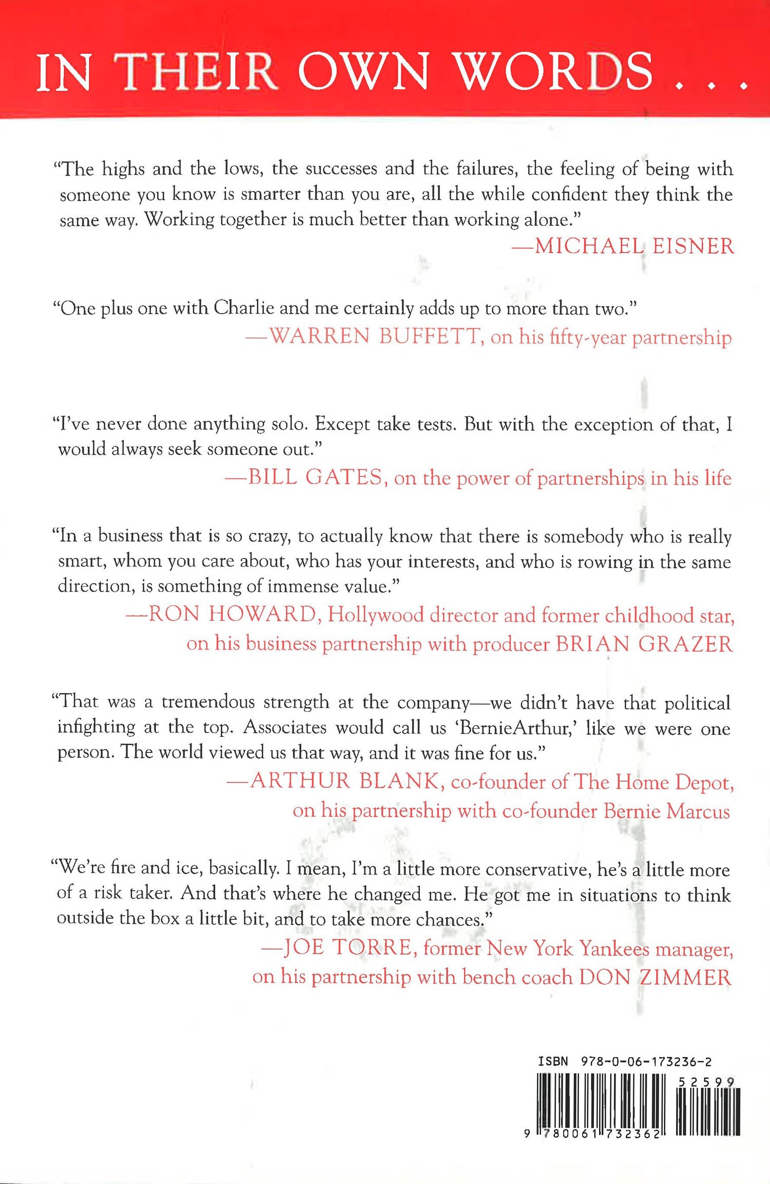Dig deep and you will find the most compelling argument for working together: Happiness. In business there are always unique individual achievers, but pull down the veil and you'll often find someone alongside them. Michael Eisner does just that in Working Together. Using his own collaboration with Frank Wells at Disney as a launching point for examining other famously successful partnerships, Eisner offers us an intimate and deeply personal look at some of the most rewarding business partnerships, uncovering what makes them tick and offering unconventional wisdom and unexpected insights. In this essential book for businesspeople everywhere, Eisner shines a light on these startlingly long-lasting and enriching partnerships, weaving together ten separate narratives--from investment gurus to entertainment impresarios, from fashion designers to big-box retailers--into a larger story about the true nature of achievement in life and in business. Ten Stories, Ten Magical Partnerships: Michael D. Eisner and Frank Wells (Disney) Warren Buffett and Charlie Munger (Berkshire Hathaway) Bill and Melinda Gates (The Gates Foundation) Brian Grazer and Ron Howard (Imagine Entertainment) Valentino and Giancarlo Giammetti (Valentino) Ian Schrager and Steve Rubell (Studio 54) Arthur Blank and Bernie Marcus (The Home Depot) Susan Feniger and Mary Sue Milliken (restaurateurs) Joe Torre and Don Zimmer (New York Yankees) John Angelo and Michael Gordon (finance) Collectively, the stories you're about to read form a blueprint for building partnerships that matter, that last, and that allow each of us to do our very best work. *This book may have remainder mark.