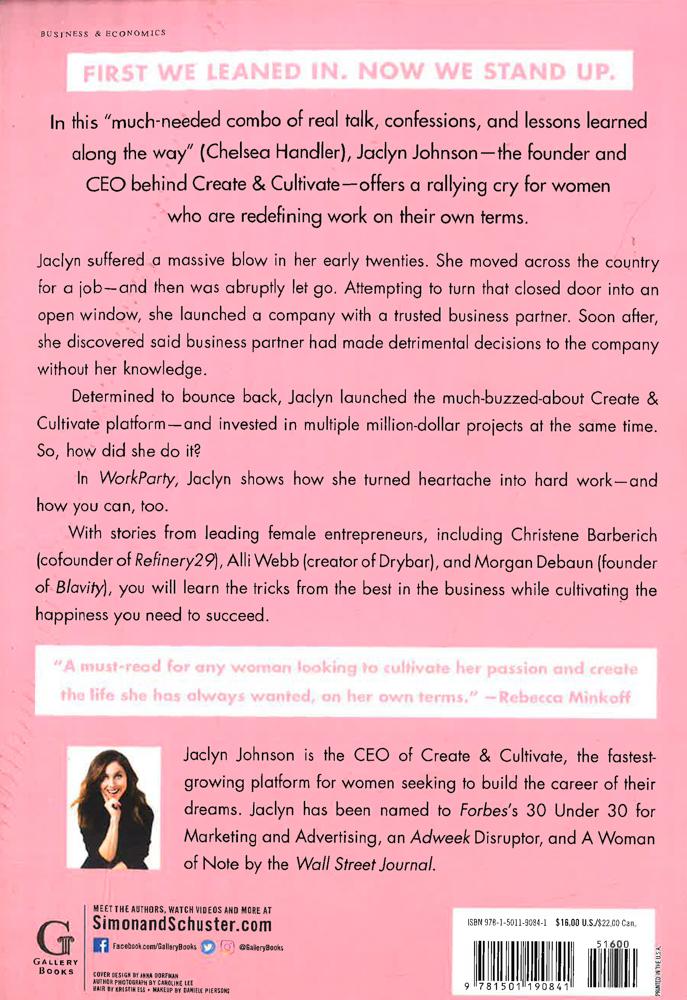First, we leaned in. Now we stand up. In this "much-needed combo of real talk, confessions, and lessons learned along the way" (Chelsea Handler), Jaclyn Johnson--the founder and CEO behind Create & Cultivate, the fastest growing online platform for millennial businesswomen--offers a rallying cry for a new generation of women who are redefining the meaning of work on their own terms. Jaclyn suffered a massive blow in her early twenties. She was on an upward career climb and confidently moved across the country for a job--and then, was abruptly let go. Attempting to turn that closed door into an open window, she launched a company with a trusted business partner. Soon after, she discovered said business partner had made detrimental decisions to the company without her knowledge. Before she knew it, she was in the throes of a brutal business partner break up. She was only twenty-four. Determined to bounce back, Jaclyn overhauled the mess that was her life and by the time she was in her early thirties, she had sold a company and launched the much-buzzed about Create & Cultivate platform--and advised and invested in multiple million-dollar projects at the same time. So, how did she do it? In WorkParty, Jaclyn shows how she turned distrust into determination, frustration into fuel, and heartache into hard work--and how you can, too. With stories from leading female entrepreneurs including Christene Barberich (co-founder of Refinery29), Alli Webb, (creator of Drybar), Morgan Debaun (founder of Blavity), Jen Gotch of Ban.do, Rebecca Minkoff, and Kendra Scott, you will learn the tips and tricks from the best in the business while cultivating the passion and happiness you need to succeed. "This is the book you need to take your career to the next level--on your own terms" (Refinery29).