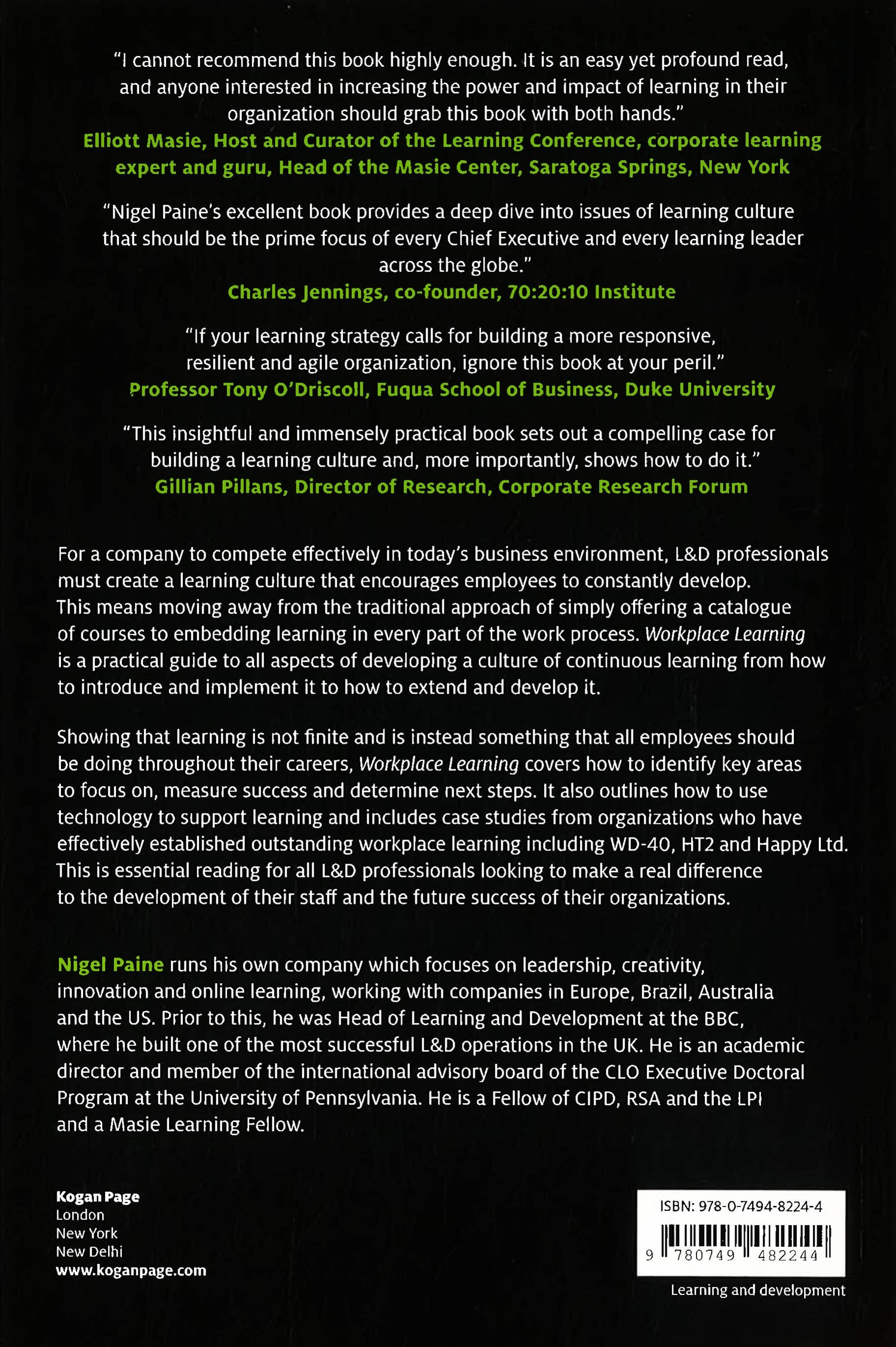 For a company to compete effectively in today's business environment, its employees need to be adaptive and agile so they can develop the required skills and knowledge. To achieve this, L&D professionals must create a culture of workplace learning that encourages employees to constantly develop. This means moving away from the traditional approach of simply offering a catalogue of courses to embedding learning in every part of the company. Workplace Learning is a practical guide to all aspects of developing a culture of continuous workplace learning, from how to introduce and implement this culture to how to develop it. Showing that learning is not finite and is instead something that all employees should be doing continuously throughout their careers, Workplace Learning covers how to identify key areas to focus the most effort on, measure success and determine next steps. It also outlines how to use technology to support workplace learning from MOOCs through to apps such as Knewton and Degreed. Packed with case studies from organizations who have effectively established outstanding workplace learning including Microsoft, PricewaterhouseCoopers (PwC), HT2 and The Happy Company, this is essential reading for L&D professionals looking to make a real difference to the development of their staff and the future success of their organizations.