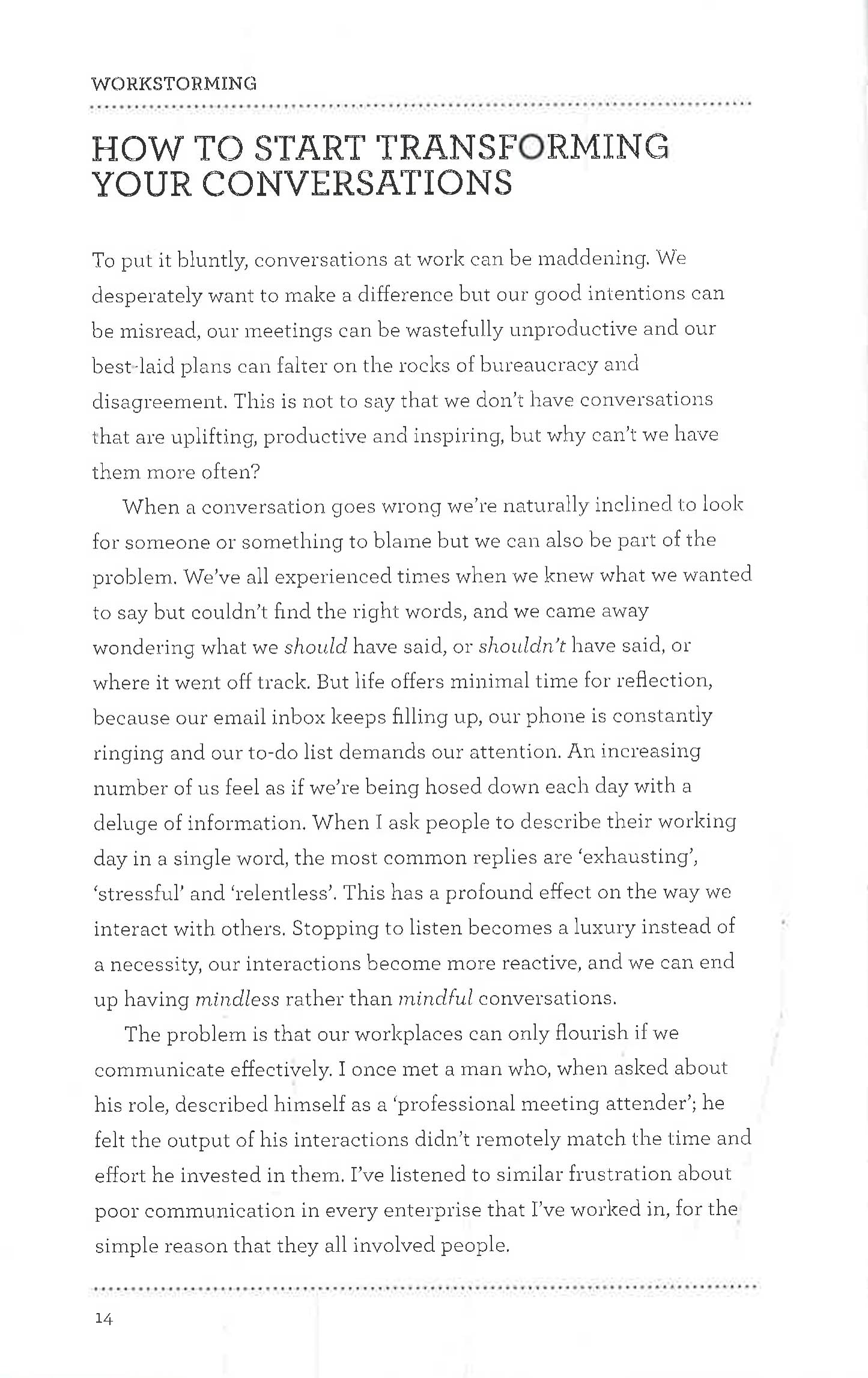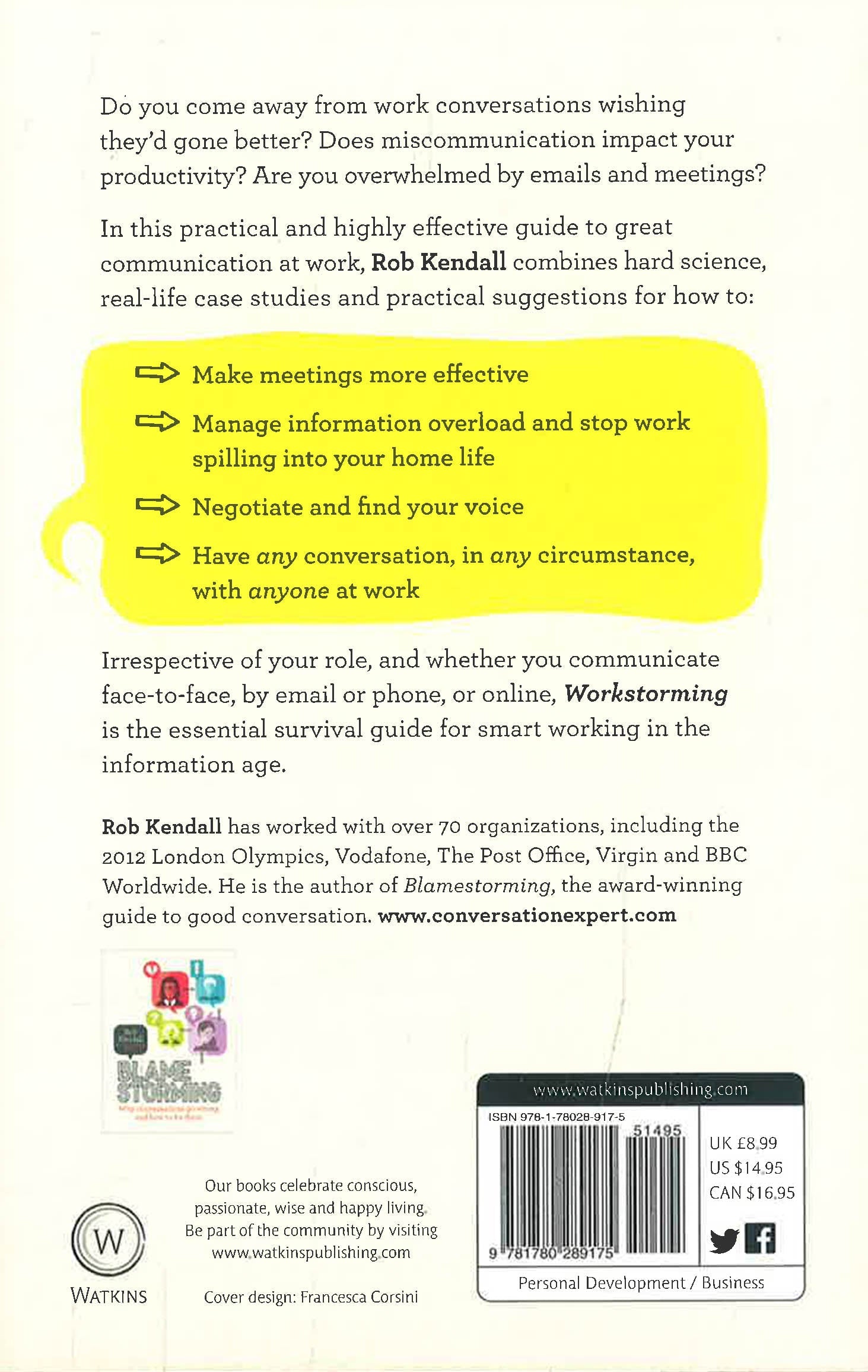 Do you come away from work conversations wishing they'd gone better? Does miscommunication impact your productivity? Are you overwhelmed by emails and meetings? In this practical and highly effective guide to great communication at work, Rob Kendall combines hard science, real-life case studies and practical suggestions for how to:* Make meetings more effective* Manage information overload and stop work spilling into your home life* Negotiate and find your voice * Have any conversation, in any circumstance with anyone at workIrrespective of your role, and whether you communicate face-to-face, via email or phone, or online, Workstorming is the essential survival guide for smart working in the information age.