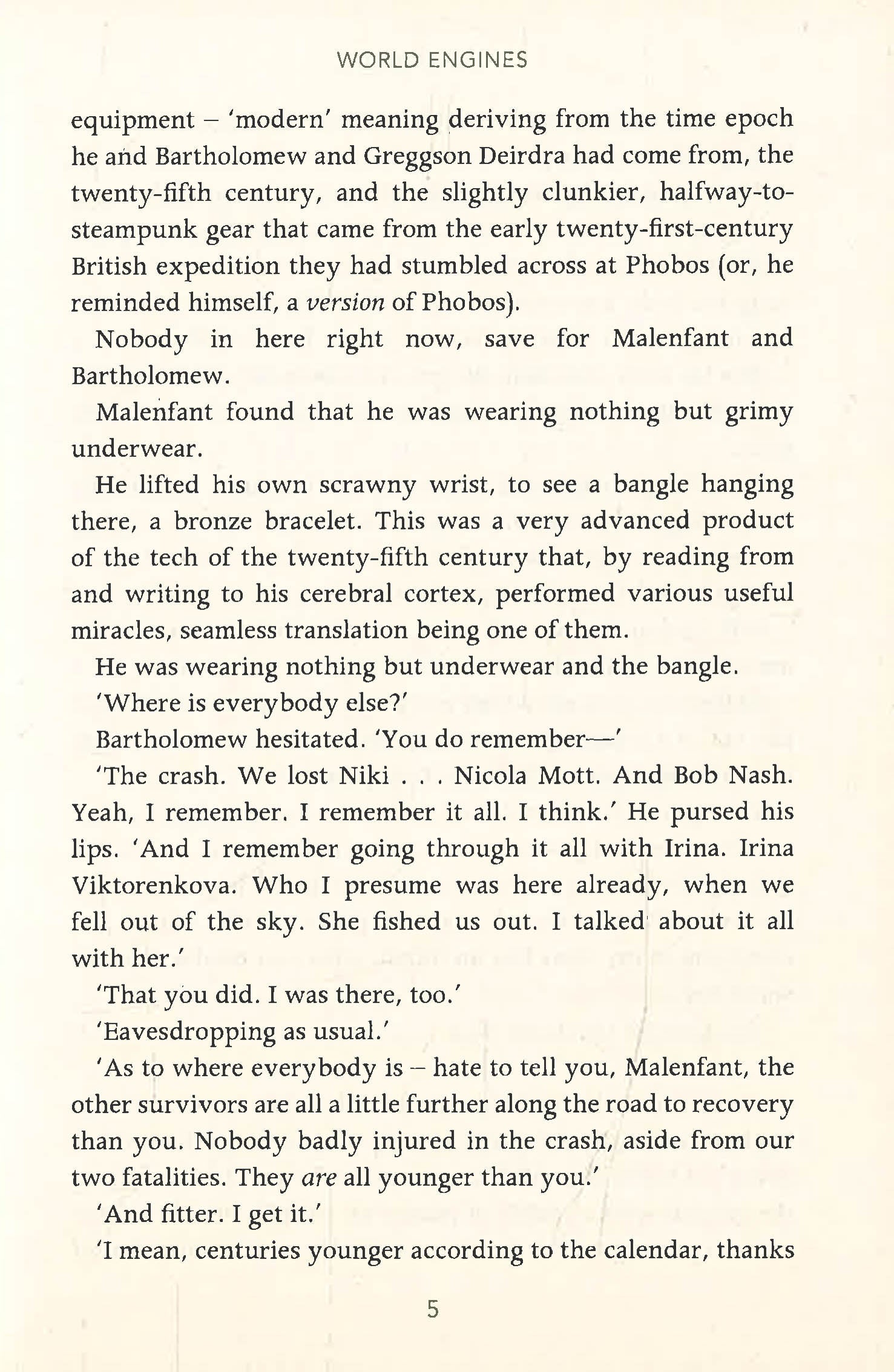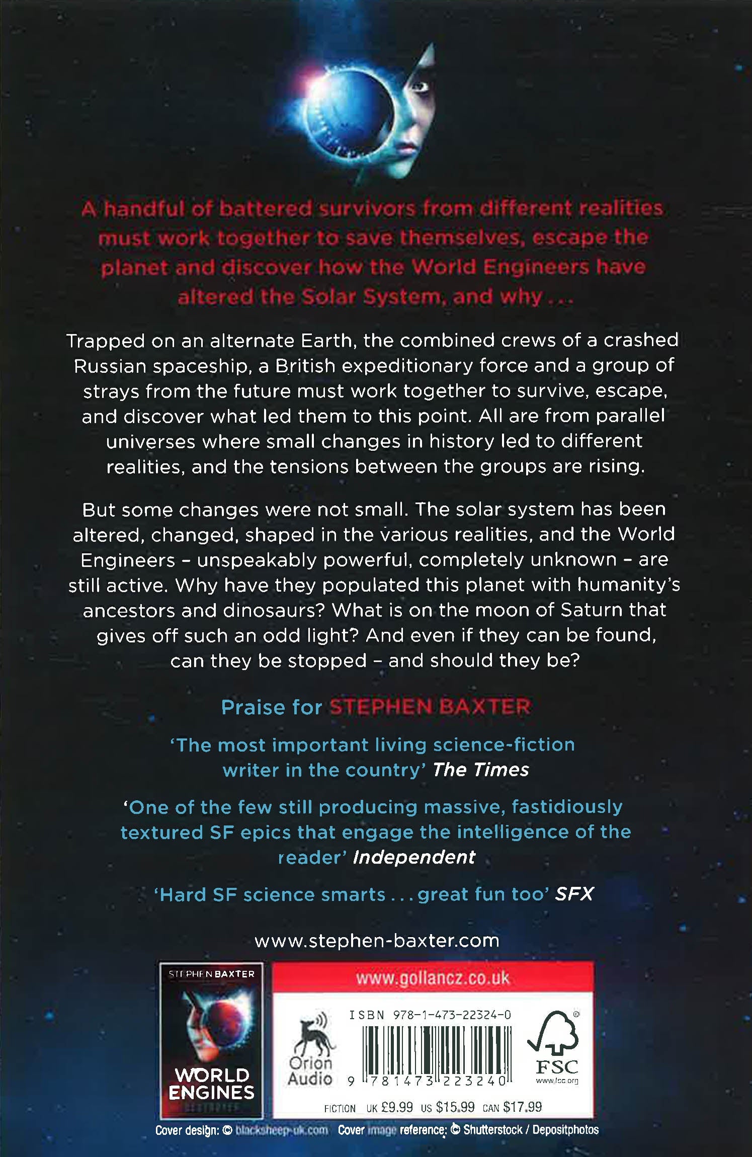 Trapped on an alternate Earth, the combined crews of a crashed Russian spaceship, a British expeditionary force and a group of strays from the future must work together to survive, escape, and discover what led them to this point. All are from parallel universes where small changes in history led to different realities, and the tensions between the groups are rising. But some changes were not small. The solar system has been altered, changed, shaped in the various realities, and the World Engineers - unspeakably powerful, completely unknown - are still active. Why have they populated this planet with humanity's ancestors and dinosaurs? What is on the moon of Saturn that gives off such an odd light? And even if they can be found, can they be stopped - and should they be?