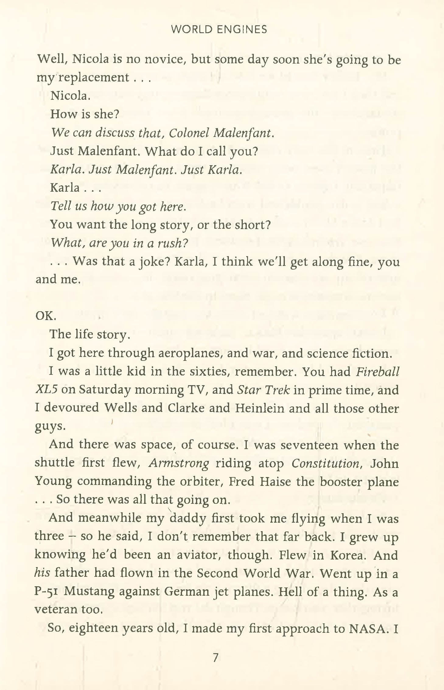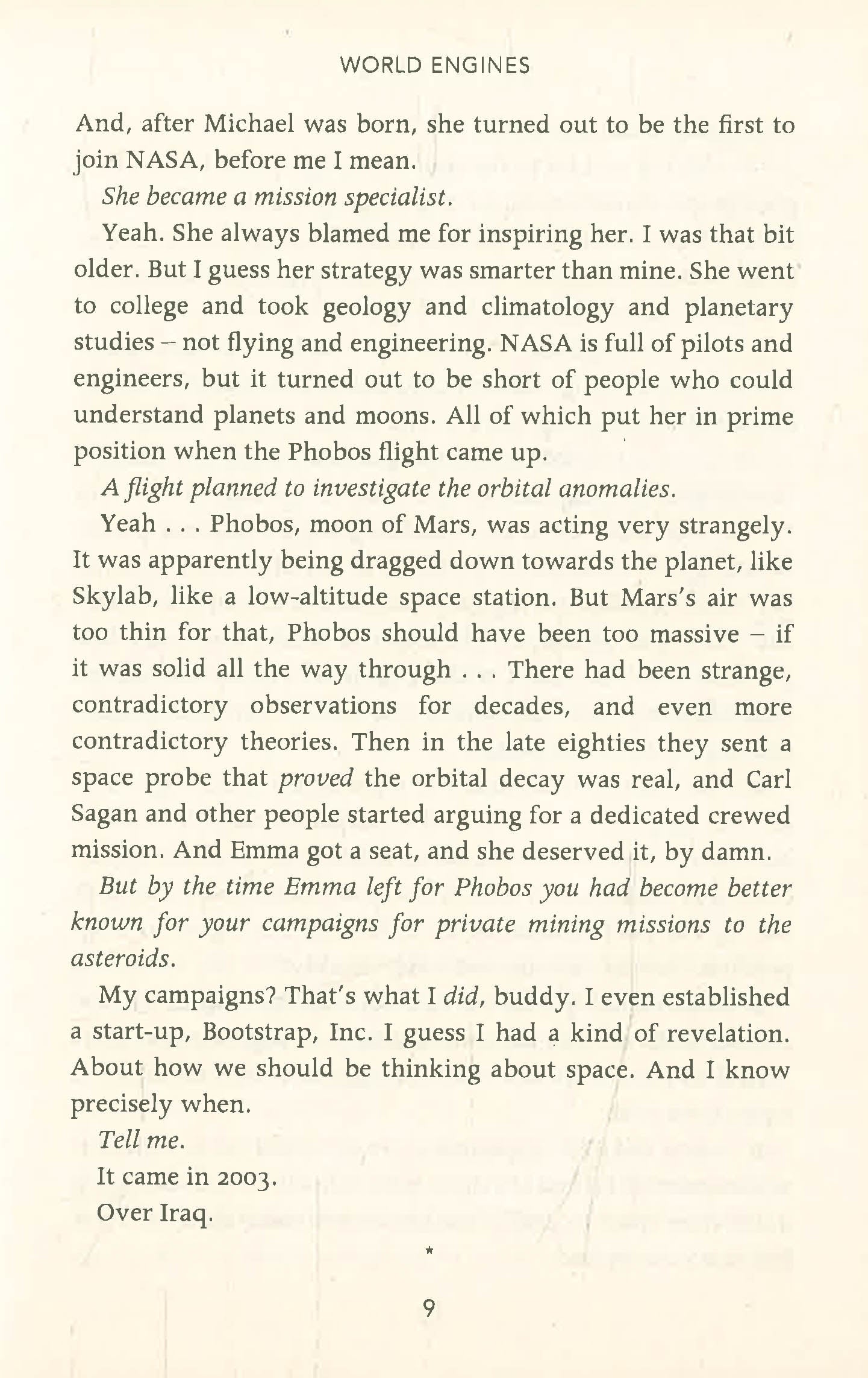 In the mid-21st century, the Kernel, a strange object on a five-hundred-year-orbit, is detected coming from high above the plane of the solar system. Could it be an alien artefact? In the middle of climate-change crises, there is no mood for space-exploration stunts - but Reid Malenfant, elderly, once a shuttle pilot and frustrated would-be asteroid miner, decides to go take a look anyway. Nothing more is heard of him. But his ex-wife, Emma Stoney, sets up a trust fund to search for him the next time the Kernel returns . . .
