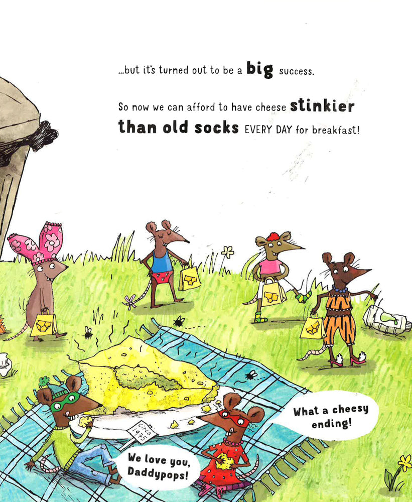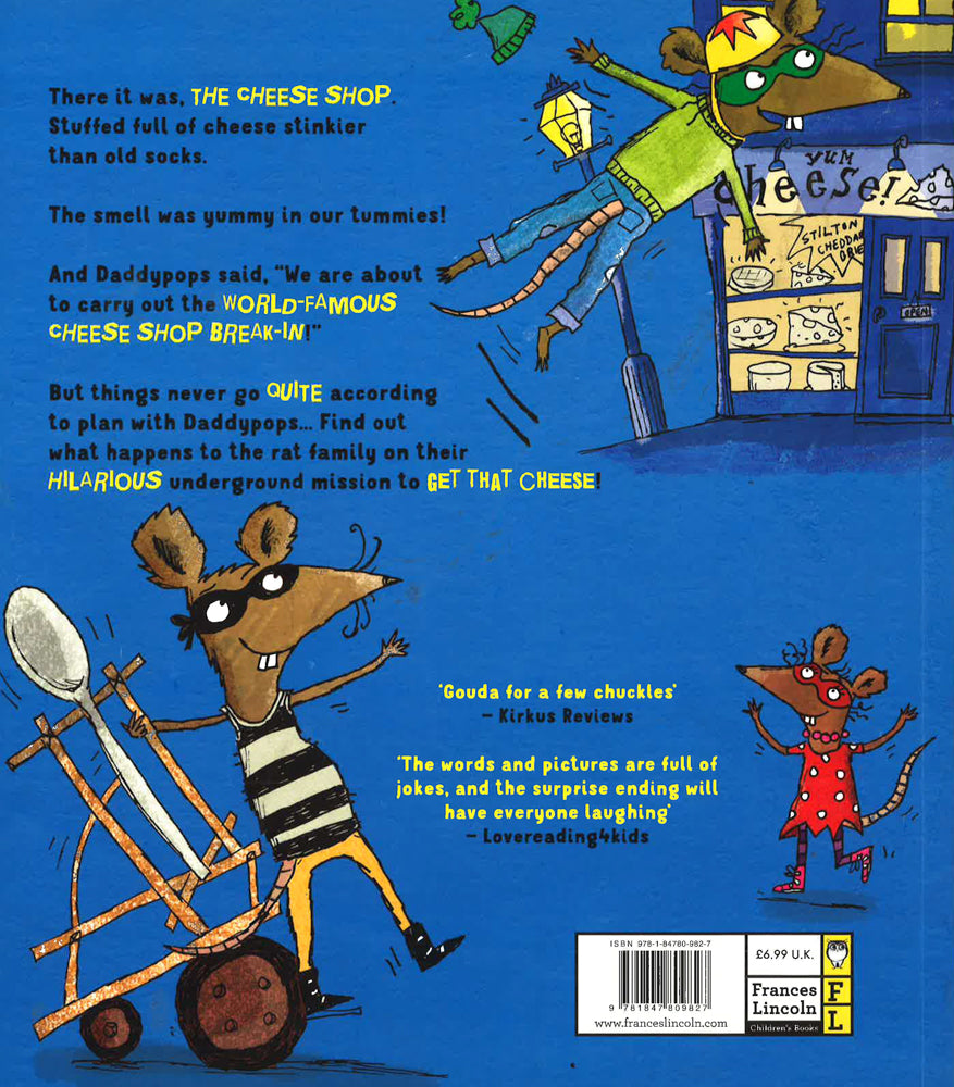 There it was, between The Greengrocer' s and The Underwear Outfitters. The Cheese Shop. It was stuffed full of cheese stinkier than old socks. And Daddypops said just what I knew he was going to..." We are about to carry out the World-Famous Cheese Shop Break-In." Daddypops says it will be as easy as 123 to get into the Cheese Shop...First he tells his children to just walk through the door and get the cheese...But THAT doesn' t work. Then he makes a catapult and fires them into the shop...THAT doesn' t work either. Finally Daddypops has his most brilliant idea ever. He gets a pickaxe, a shovel and a bucket and tells the children what to do. They will dig a tunnel to the Cheese Shop, and break through to the shop floor at dead of night. What could go wrong In this laugh-out-loud story, the rats get the surprise of their lives when they pop out of their tunnel. They are not in the Cheese Shop at all - they' re surrounded by Fancy Pants and Underwear. And that' s when Daddypops has another good idea...!