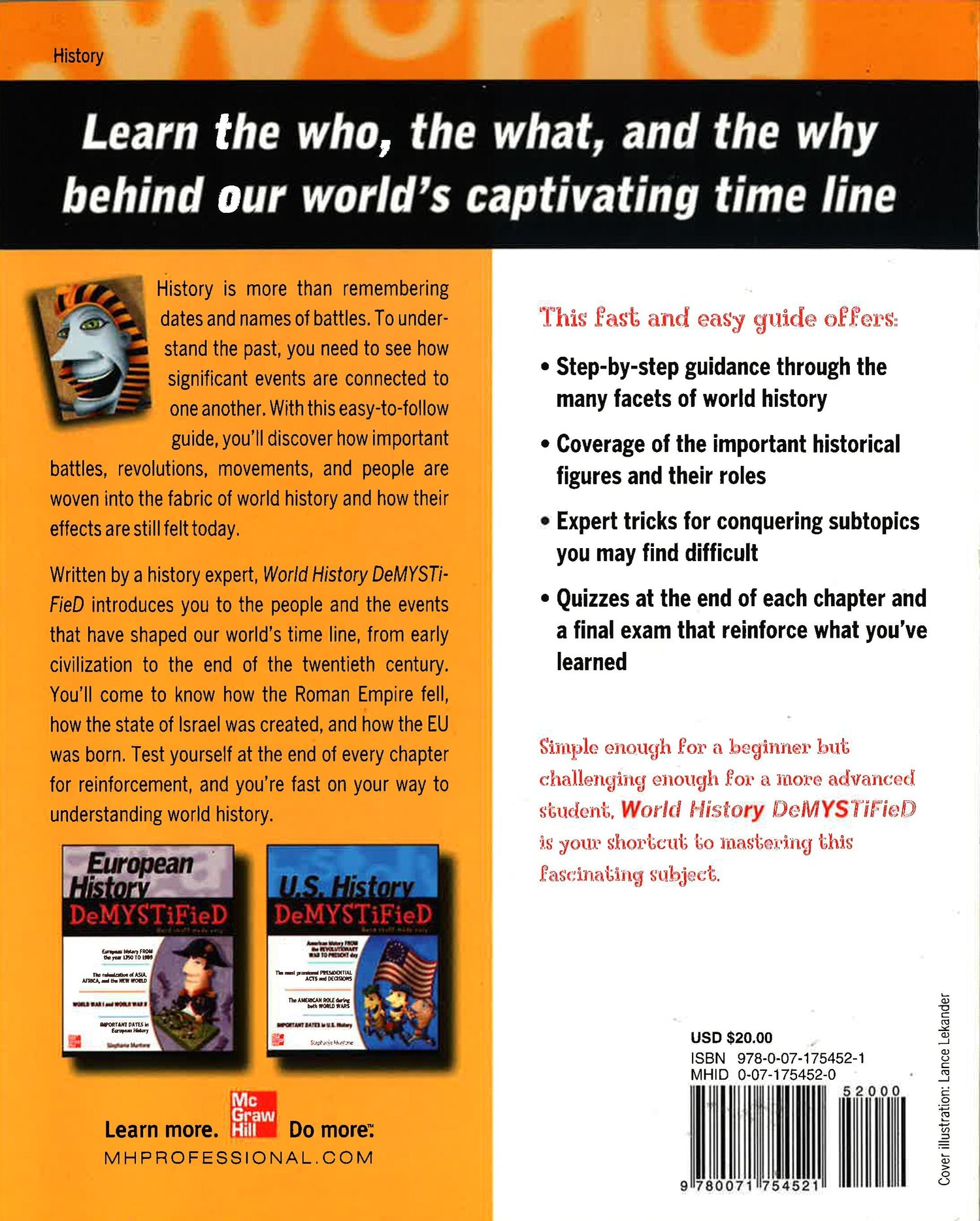 World History DeMYSTiFieD gives you the opportunity to learn this subject at your own pace. Master topics such as important dates; the great civilizations of Ancient Greece and Rome Empires; the scientific developments of the Ancient Egyptians; the various dynasties of China; as well as fun and interesting facts. The book helps you truly comprehend this challenging subject a without overwhelming you with complexities or mystifying jargon.
