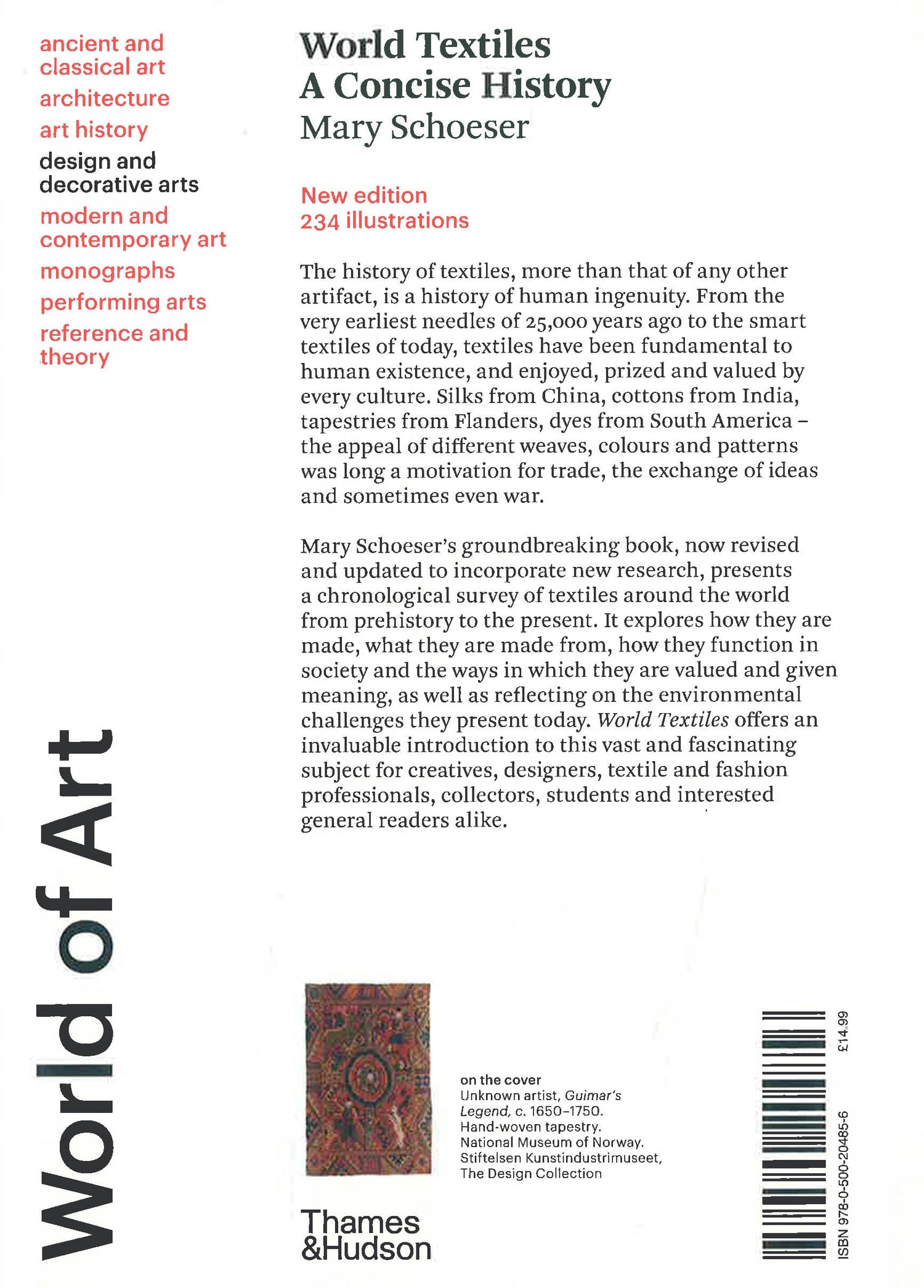 Mary Schoeser’s groundbreaking book, now revised and updated to incorporate new research, presents a chronological survey of textiles around the world from prehistory to the present. It explores how they are made, what they are made from, how they function in society and the ways in which they are valued and given meaning as well as reflecting on the environmental challenges they present today. World Textiles offers an invaluable introduction to this vast and fascinating subject for makers, designers, textile and fashion professionals, collectors and students alike.