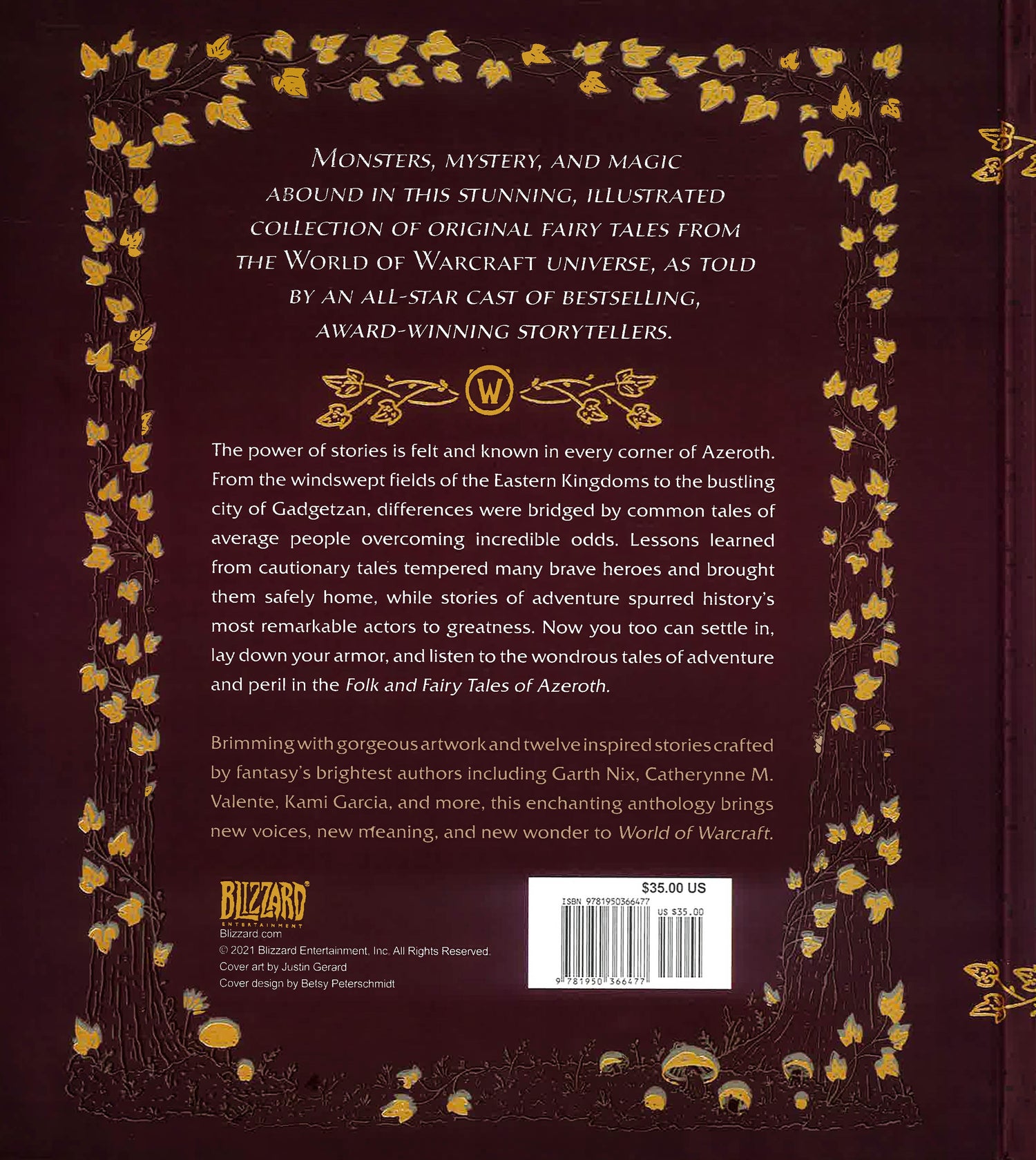 The power of stories is felt and known in every corner of Azeroth. From the windswept fields of the Eastern Kingdoms to the bustling city of Gadgetzan, differences were bridged by common tales of average people overcoming incredible odds. Lessons learned from cautionary tales tempered many brave heroes and brought them safely home, while stories of adventure spurred history’s most remarkable actors to greatness. Now you too can settle in, lay down your armor, and listen to the wonderous tales of adventure and peril in the Folk and Fairy Tales of Azeroth. Brimming with gorgeous artwork and twelve inspired stories crafted by fantasy’s brightest authors including Garth Nix, Catherynne M. Valente, Kami Garcia, and more, this enchanting anthology brings new voices, new meaning, and new wonder to World of Warcraft.