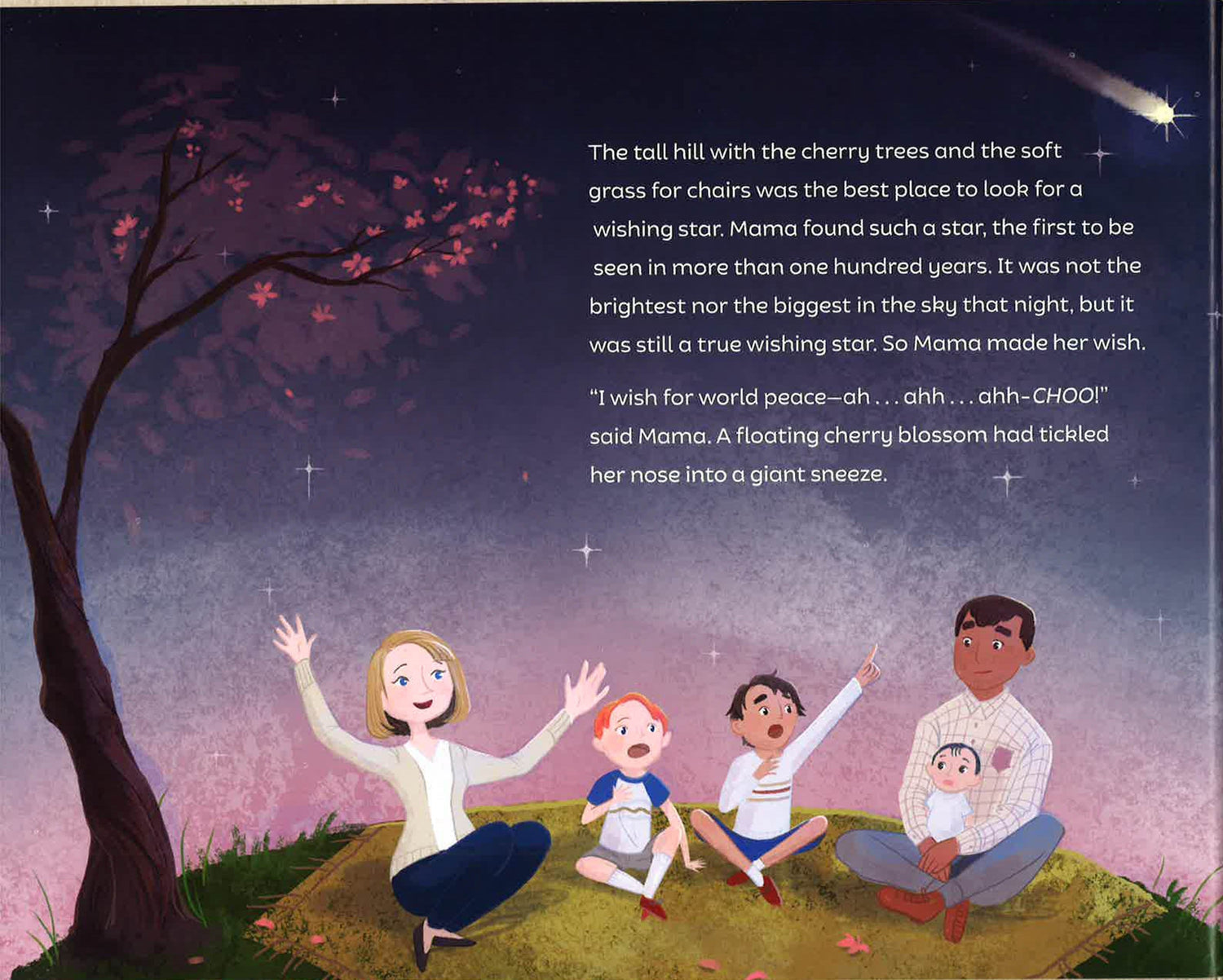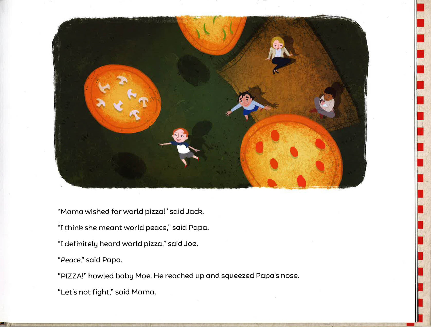 When Momma spots a wishing star, she starts to ask for world peace - but a sneeze changes "peace" into "peace-AH-AH-AH-choo!" World PIZZA! Suddenly, yummy pies of every kind come drifting down from the sky. That’s not exactly what Momma hoped for . . . or is it? With humor, warmth, and heart, this delicious picture book celebrates the things that truly bring us together.