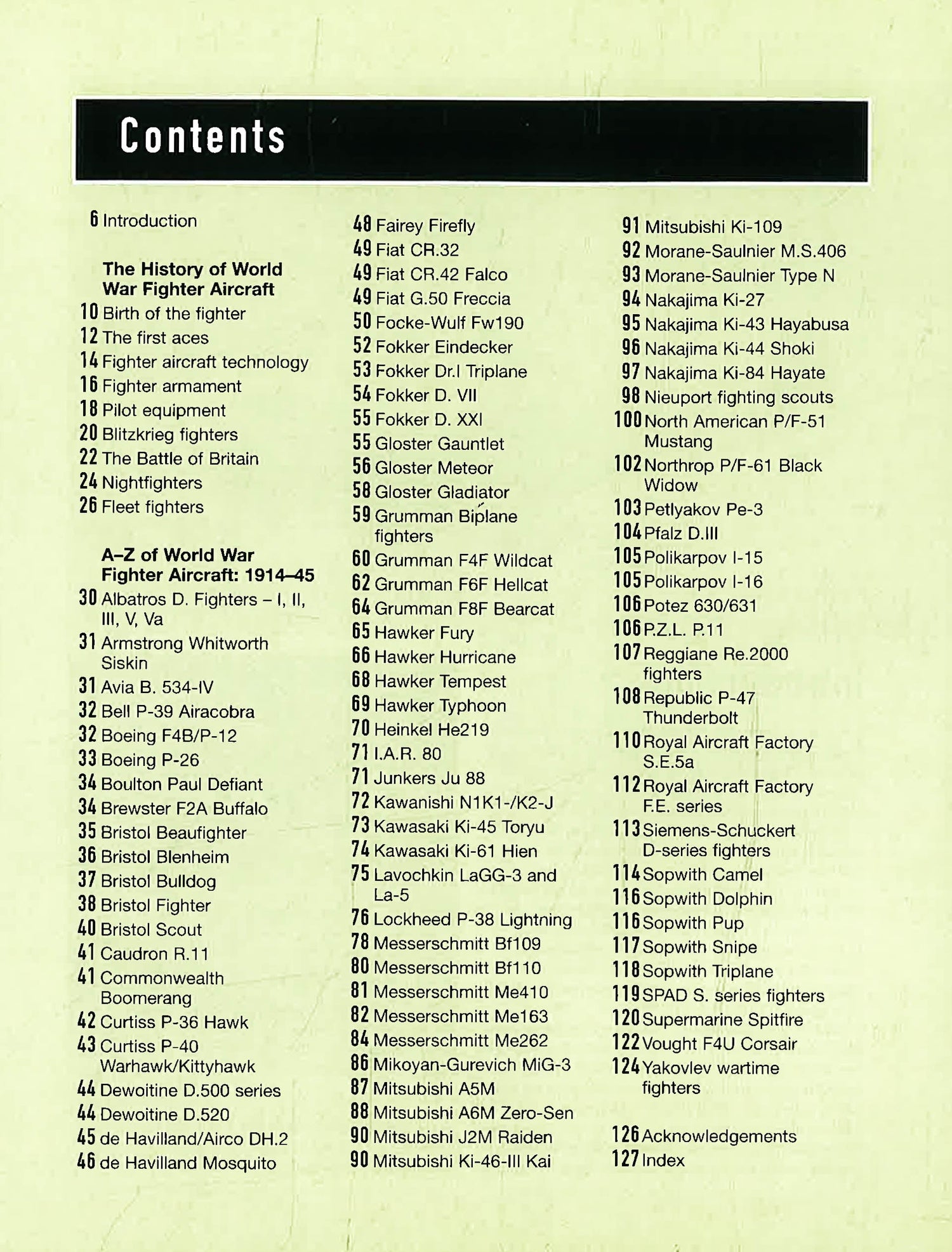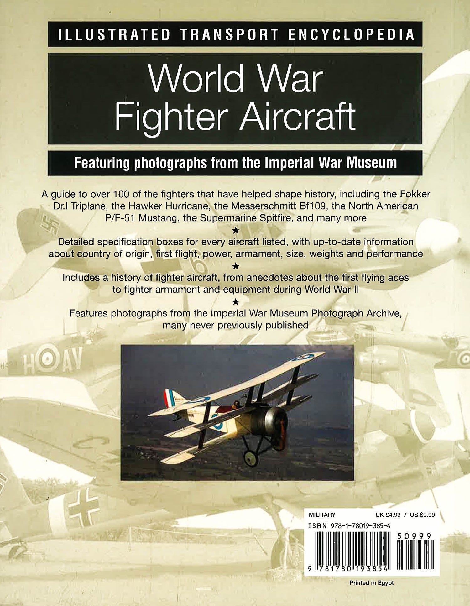 This title featuring photographs from the Imperial War Museum. It is a guide to over 100 of the fighters that have helped shape history, including the Fokker Dr. I Triplane, the Hawker Hurricane, the Messerschmitt Bf109, the North American P/F-51 Mustang and the Supermarine Spitfire. It features detailed specification boxes for every aircraft listed, with information about country of origin, first flight, power, armament, size, weights and performance. It includes a history of fighter aircraft, from anecdotes about the first flying aces to fighter armament and equipment during World War II. Since World War I, fighter planes have played a crucial role in history: they have won wars, prevented wars and defended nations from aggressors. This book is a fully illustrated guide to over 100 of these history-making aeroplanes. It contains an A-Z guide to fighters of the two World Wars, and is brimming with information and often rare photographs of classic fighter aircraft, including the Fokker Triplane, the Bristol Fighter, the Spitfire and the P-51 Mustang.