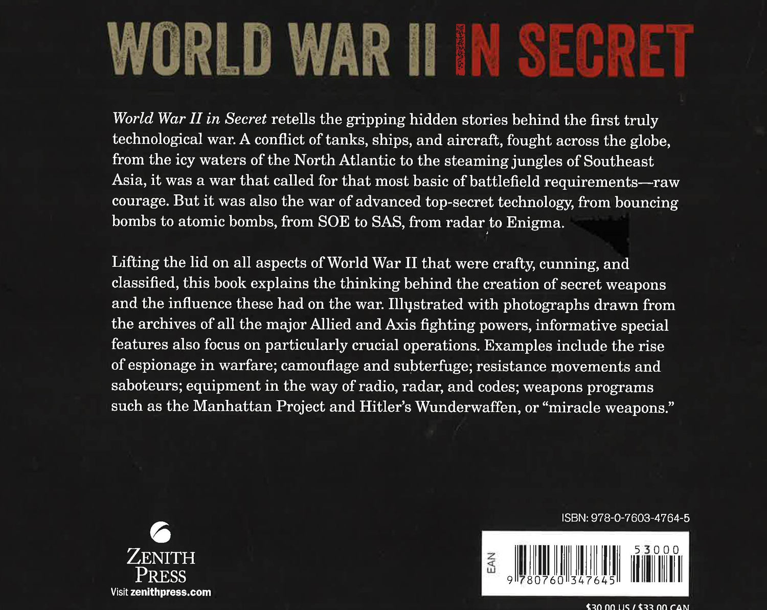 Explore the mysteries and secrets of World War II from both sides! World War II in Secret profiles the many undisclosed and secretive stories of World War II, complete with copious illustrations and photographs drawn from the archives of all the major Allied and Axis powers. Espionage, radio, radar, and codes technology, resistance movements and saboteurs, weapons programs, camouflage and suberterfuge, and covert operations are all explored and uncovered to their smallest detail.Many techniques and technologies were either created or perfected during World War II. Many, such as the German use of blitzkrieg, radar, a human torpedo, the Enigma code, Barnes Wallis' bouncing bombs, soldiers on steroids, armies on amphetamines, America's Nisei, Project Z, Operation Bagration, the Double Cross, ghost armies, V weapons, the Wunderwaffen, and the Manhattan Project changed the course of world history forever. Award-winning military history author Gavin Mortimer explains them all, along with a few that didn't work at all, such as the Great Panjandrum and the Giant Dart.