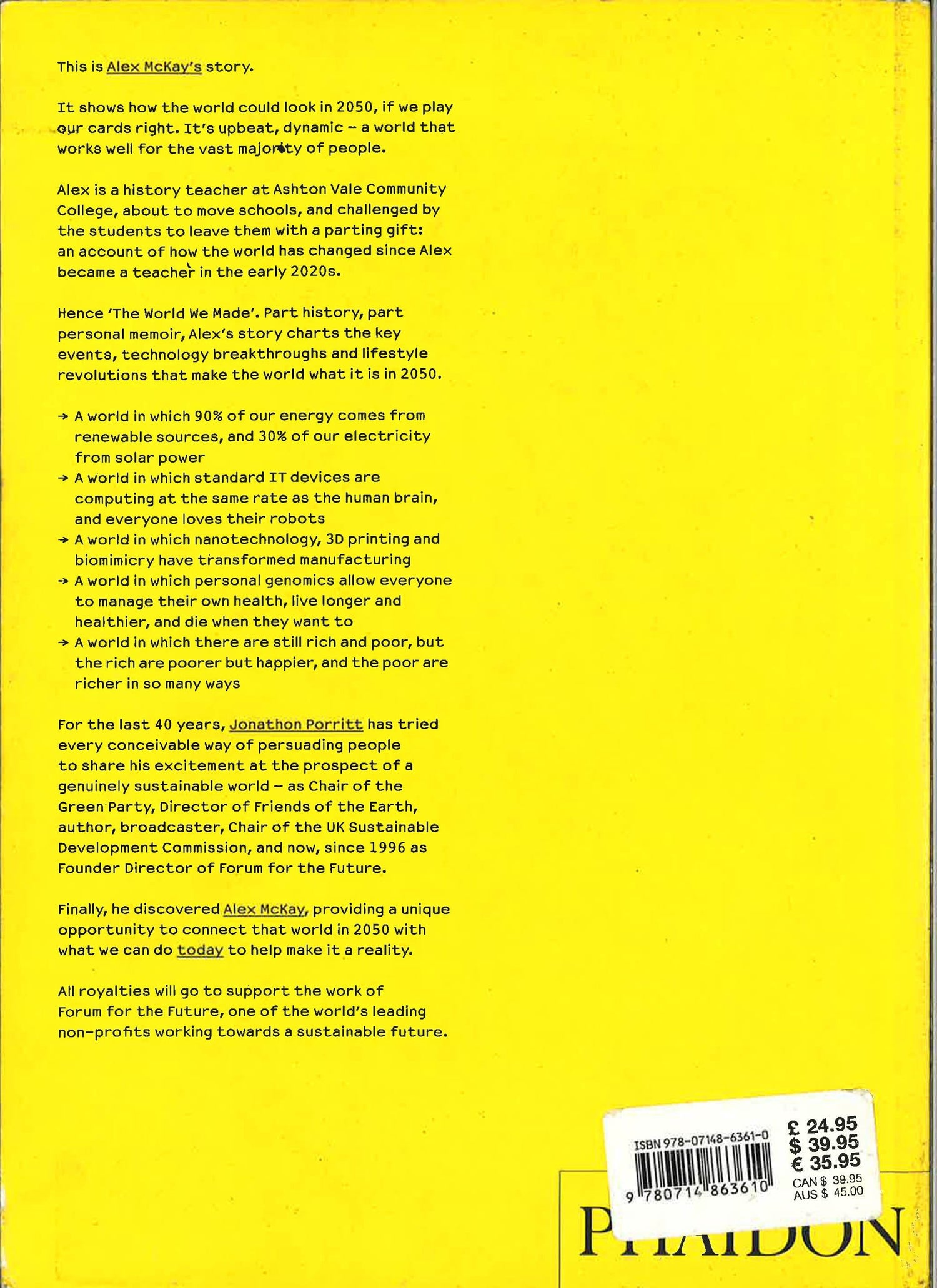 Our planet's future is too often described in terms of doom and despair. However, there is another perspective that is not only positive, but credible, too. The World We Made describes a planet that is green, fair, connected, and collaborative. Based on extensive research, leading environmentalist Jonathon Porritt reveals how we can achieve a genuinely sustainable world by 2050 if we act immediately. Part history, part narrative, The World We Made describes the key events, technological breakthroughs, and lifestyle revolutions that could transform our planet, covering topics as wide-ranging as 3D printing, personal genomics, urban agriculture, and the digital landscape. The book's innovative ideas are brought to life with futuristic photographs, infographics, and hand-drawn sketches, while an extensive index provides the tools and tips needed to prepare for what's ahead.