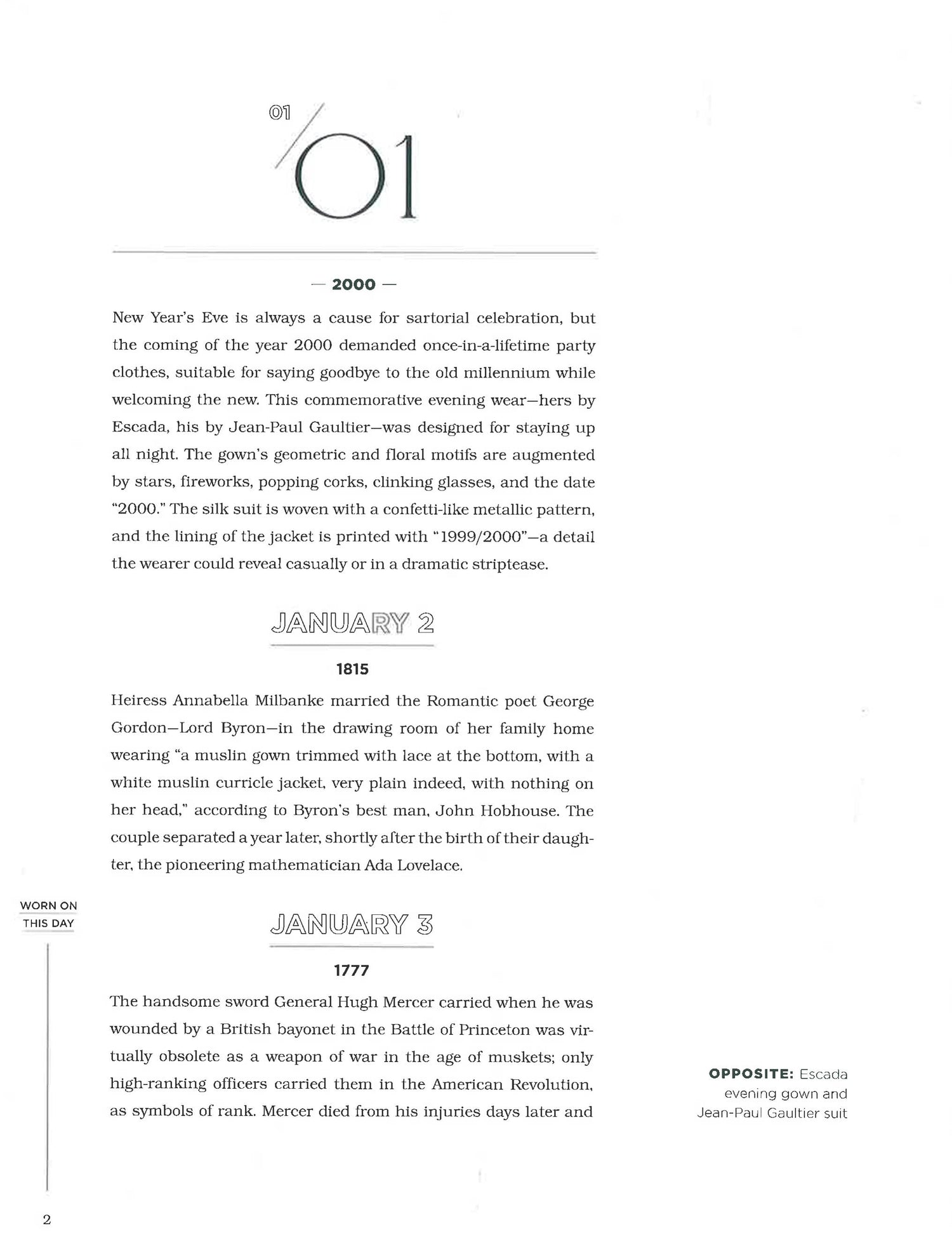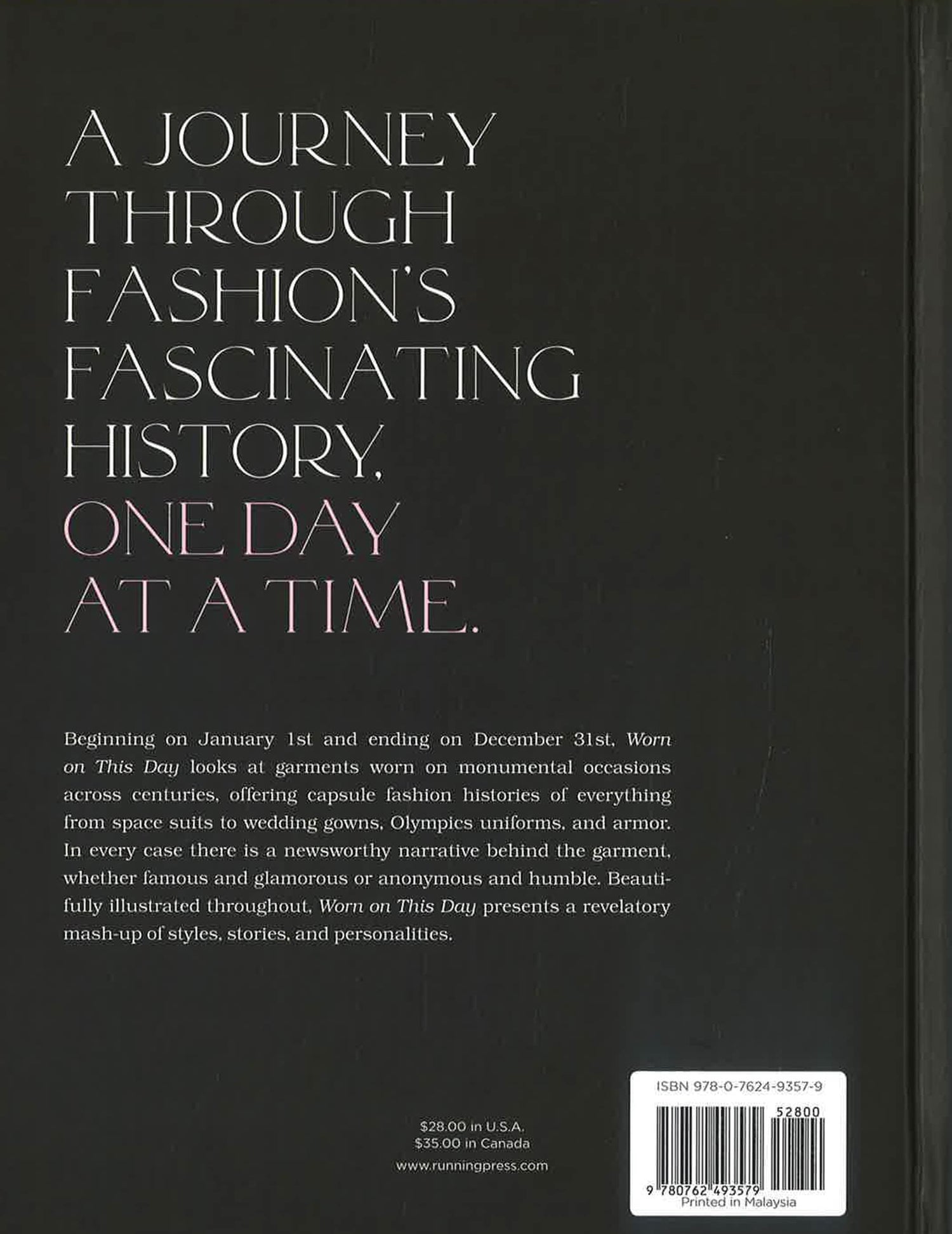 Beginning on January 1st and ending on December 31st, Worn On This Day looks at garments worn on monumental occasions across centuries, offering capsule fashion histories of everything from space suits to wedding gowns, Olympics uniforms and armour. It creates thought-provoking juxtapositions, like Wallis Simpson's June wedding and Queen Elizabeth's June coronation, or the battered shoes Marie-Antoinette and a World Trade Center survivor wore to escape certain death, just a few calendar days apart.