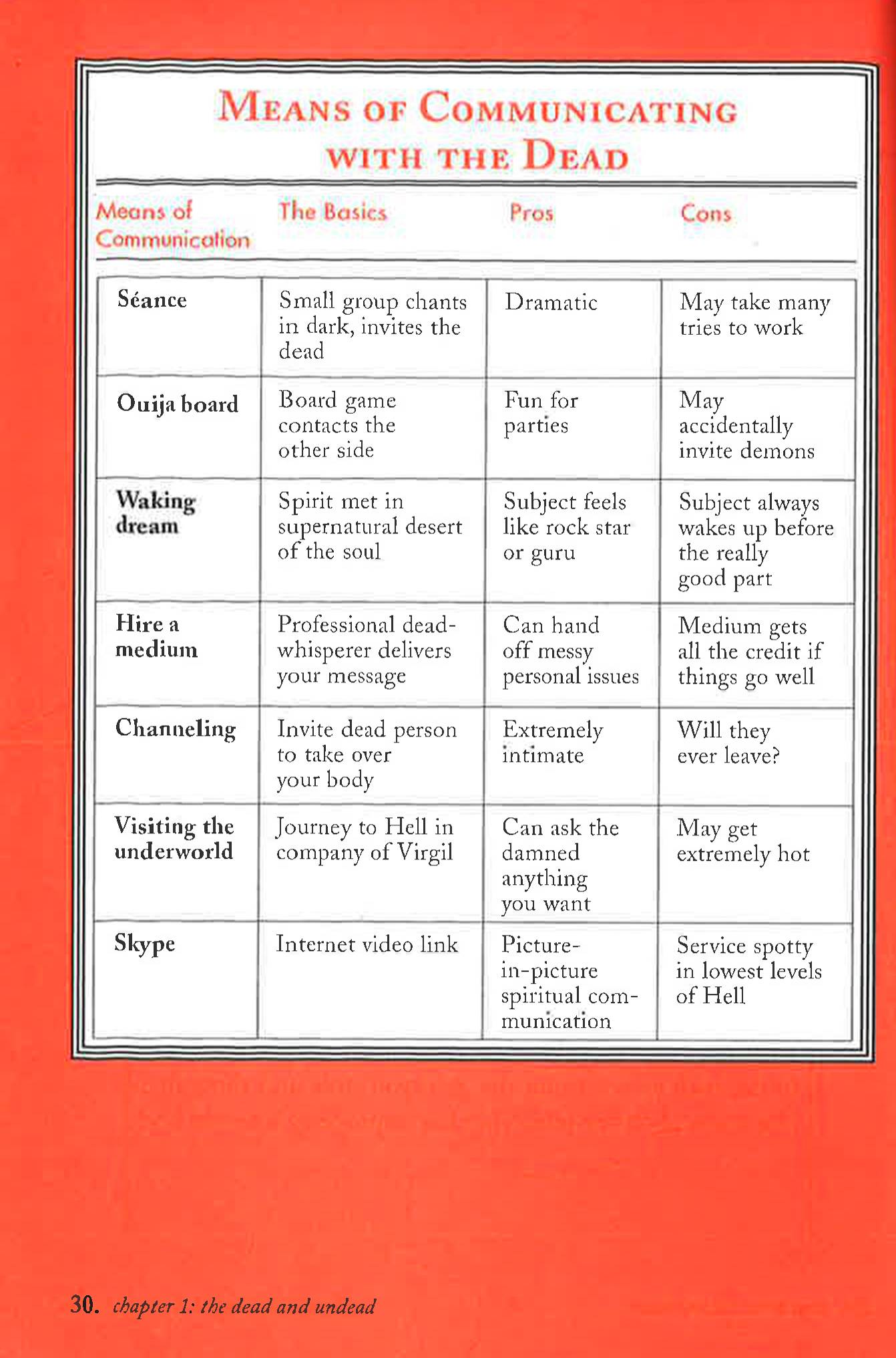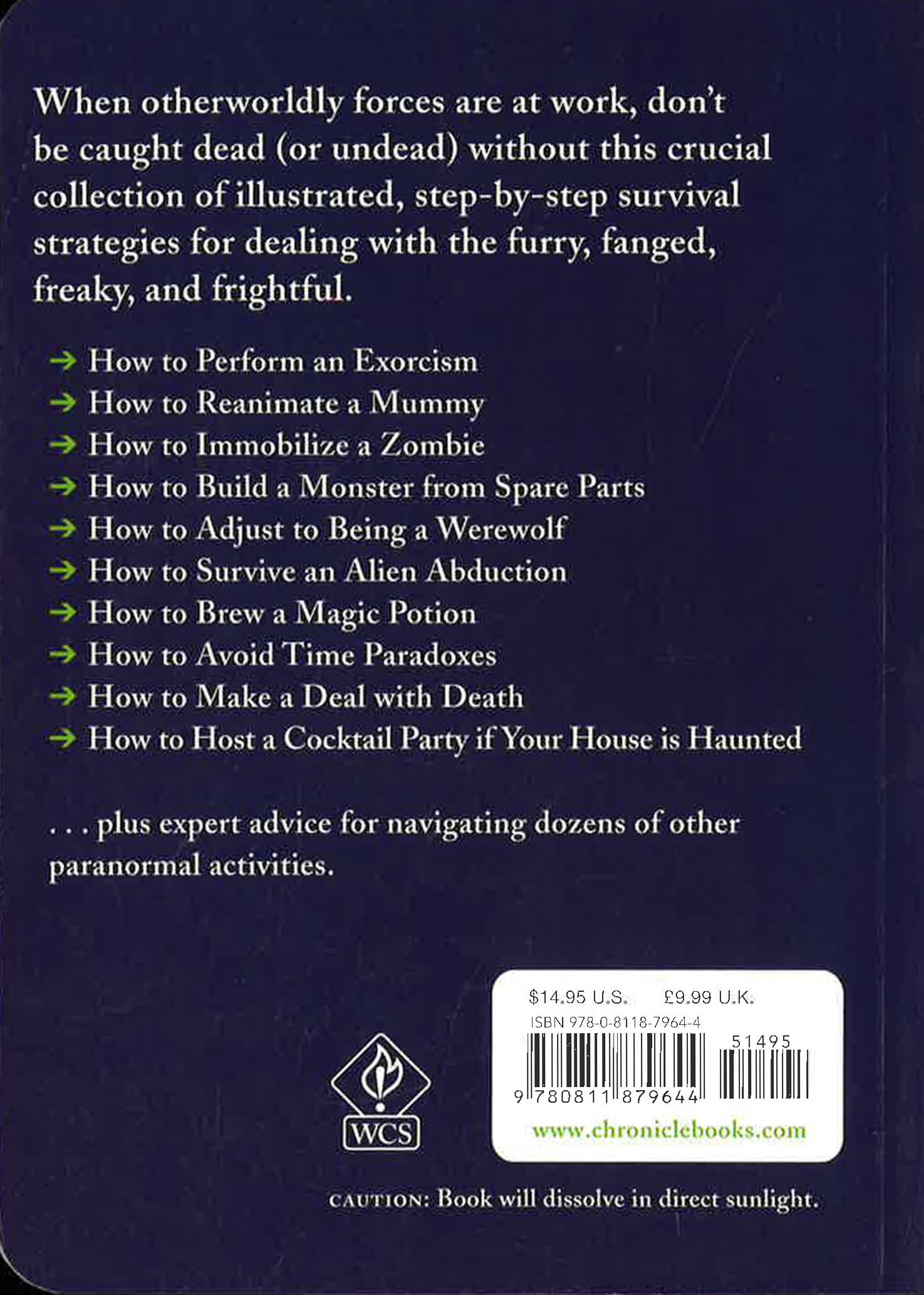 Paranormal activity is BIG in popular culture these days. Vampires, zombies, werewolves, ghosts are everywhere (look out!): on TV, in books, comics, video games and movies, hiding behind your curtains ...Luckily, the authors of the best-selling Worst-Case Scenario Survival Handbook series are back with an all-new handbook designed to help readers fend off the furry, fanged, and frightful. They cull expert advice culled from 'real' sources and deliver it in the tried and true WCS action handbook style of punchy bulleted instructions and hands-on action illustrations. Subjects covered include the beasties above, plus witchcraft and wizardry, UFOs, fairies, and more. The scenarios range from funny (How to Host a Cocktail Party When Your House is Haunted) to scary (How to Survive a Zombie Attack) to practical (What to Do If You Have Accidentally Summoned a Demon). This is in the classic 5 x 7 kivar cover handbook format. We might trick out the cover with something extra. All new content. All! New! Content!