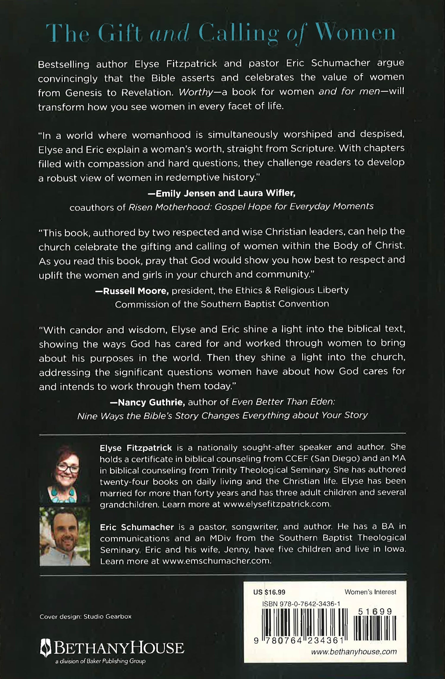 What does the Bible say about the value of women? Does the Bible teach that women are as valuable as men or does it portray them as somehow more flawed, more suspect, or weak and easily deceived? Beginning from Genesis and working all the way through the storyline of the Bible, Worthy demonstrates the significant and yes, even surprising, ways that God has used women to accomplish His kingdom goals. Because, like men, they are created in His image, their lives reflect and declare His worth. Worthy will enable and encourage both men and women to embrace this true and lofty vision of God's creation, plan, and their value in His eyes. Bestselling author Elyse Fitzpatrick and pastor Eric Schumacher together invite women to embrace a transformative and empowering view of their Maker, themselves, and the church. But this isn't only a book for women. It is also a book for men, especially leaders, who want to grow in their understanding of God's perspective on women, people who normally make up the majority of their congregations; men who might be wondering if they've missed something amid the abuse scandals that are rocking the church. Might the headlines they're reading today about abuse have their roots in a denigration of the value and worth of women? Worthy: Celebrating the Value of Women will help every reader see the value, place, and calling of women through study questions and a "Digging Deeper" section that will help men and women discover how to cherish, value, and honor one another for God's glory.