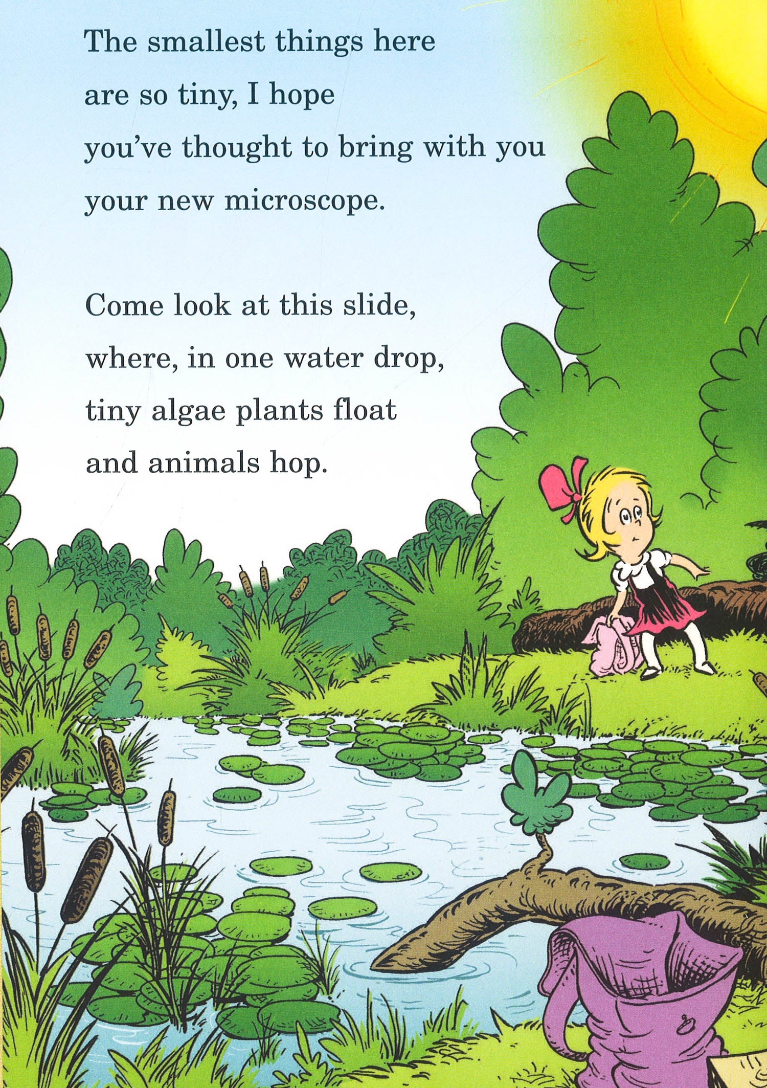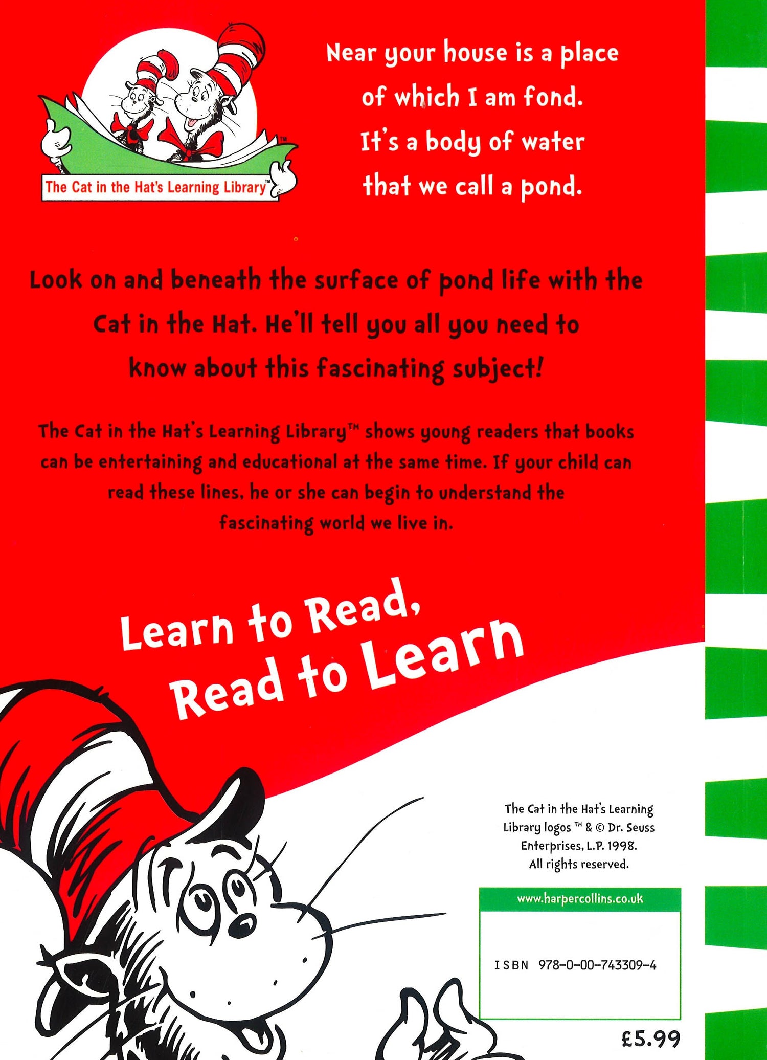 From the top to the bottom I think that you'll see that this pond here is lively as lively can be! Join the Cat in the Hat as he introduces beginning readers to ponds. This title and others form part of a series of books that takes an off-beat look at nature and natural sciences through a fun combination of Seussian rhymes and zany illustrations. Aimed at early readers - from four to seven years old - the books are designed to bridge the gap between concept books written for preschoolers and more formal non fiction titles that require fluent reading skills. By presenting the facts in a lively and rhythmic manner, they provide the critical foundation upon which complex facts and ideas can eventually be built.