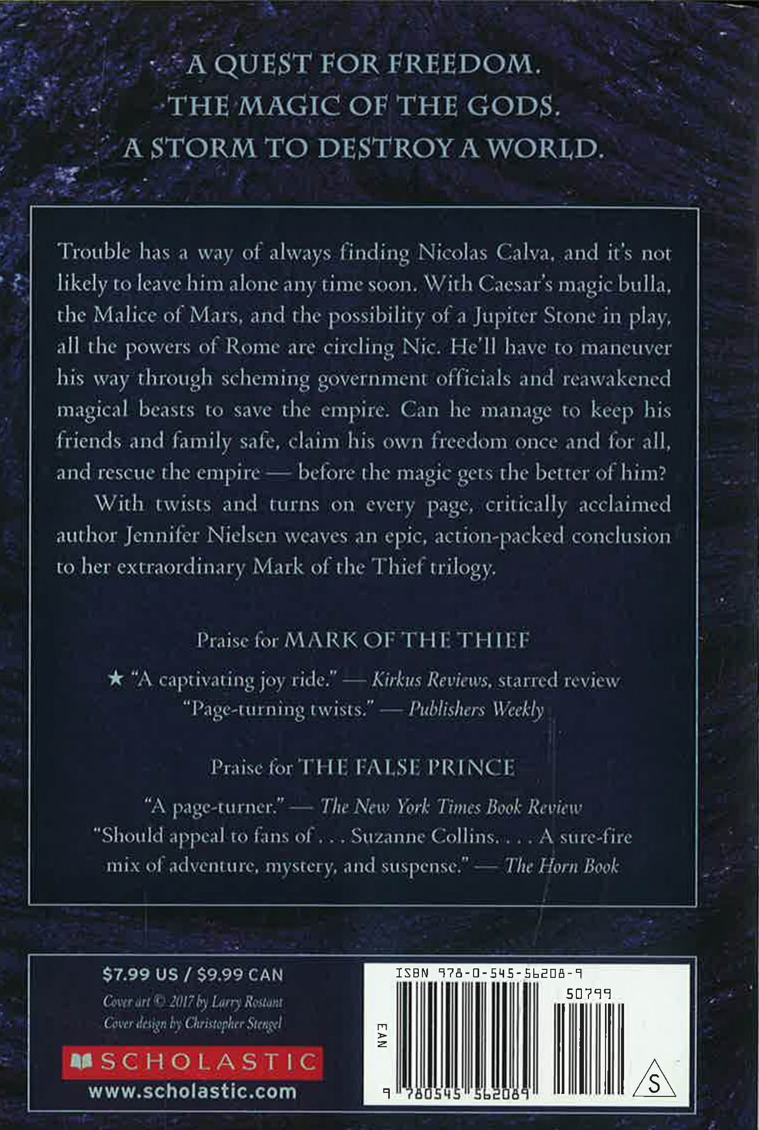 Trouble has a way of seeking out Nicolas Calva, and it's not likely to leave him alone any time soon. With Caesar's magic bulla, the Malice of Mars, and the possibility of a Jupiter Stone in play, all the powers of Rome are circling Nic. He'll have to maneuver his way through scheming government officials and reawakened magical beasts to save the Empire. Can he manage to keep his friends and family safe, claim his own freedom once and for all, and rescue the Empire -- before the magic gets the better of him? With twists and turns on every page, critically acclaimed author Jennifer Nielsen weaves an epic, action-packed conclusion to her extraordinary Mark of the Thief trilogy.