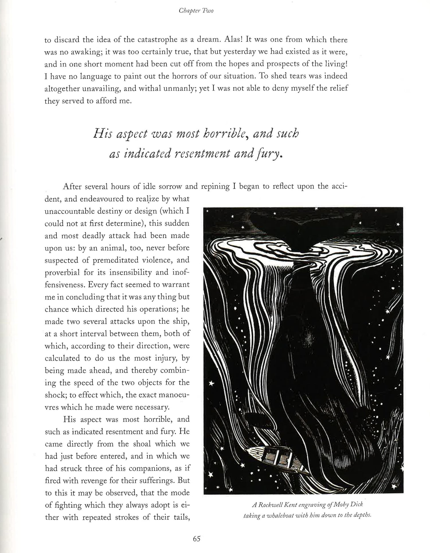 "I turned around and saw him about one hundred rods [500 m or 550 yards] directly ahead of us, coming down with twice his ordinary speed of around 24 knots (44 km/h), and it appeared with tenfold fury and vengeance in his aspect. The surf flew in all directions about him with the continual violent thrashing of his tail. His head about half out of the water, and in that way he came upon us, and again struck the ship."
