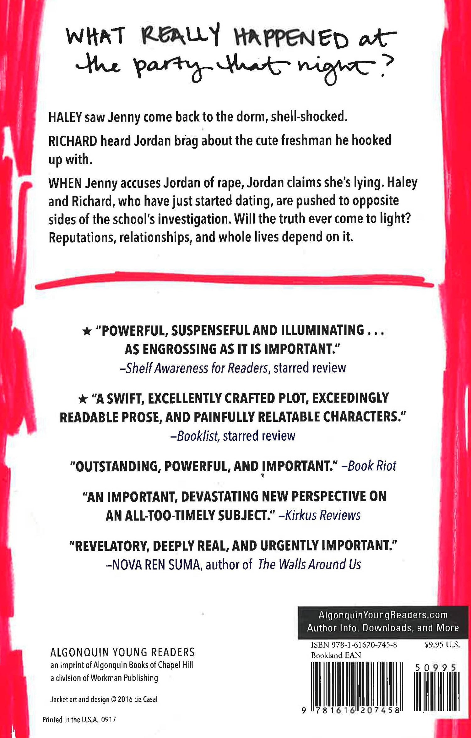 What really happened at the party that night?Haley saw Jenny come back to the dorm, shell-shocked.Ricard heard Jordan brag about the cute freshman he hooked up with.When Jenny accuses Jordan of rape, Jordan claims she's lying. Haley and Richard, who have just started dating, are pushed to opposite sides of the school's investigation. Will the truth ever come to light? Reputations, relationships, and whole lives depend on it.