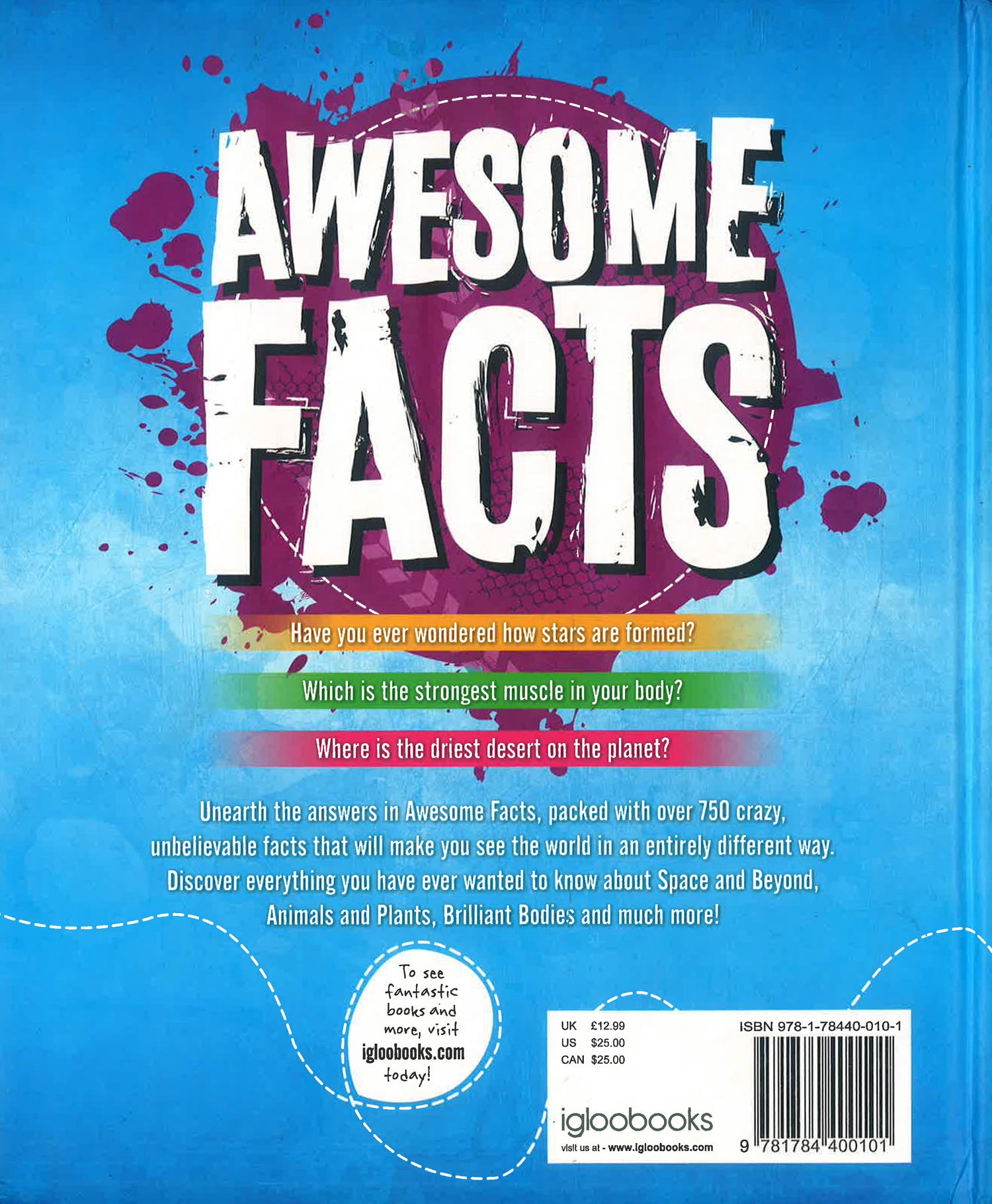 Unearth the answers in Awesome Facts, packed with over 750 crazy, unbelievable facts that will make you see the world in an entirely different way. Discover everything you have ever wanted to know about Space and Beyond, Animals and Plants, Brilliant Bodies and much more!
