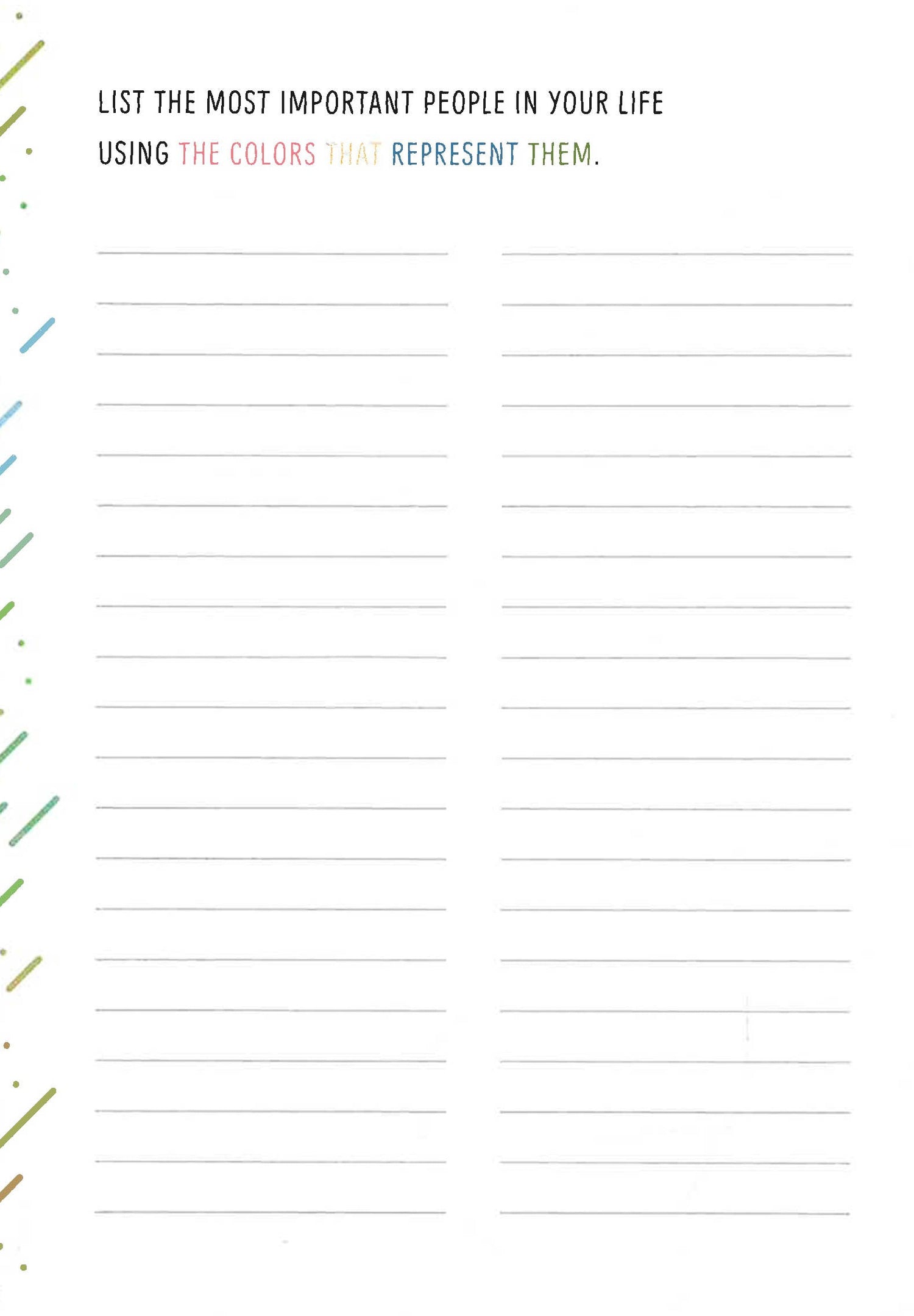 Journaling just got a lot more colorful and a whole lot more fun! Featuring playful prompts that illuminate connections between color and content?use every shade of yellow to list the things that make you happy, or describe the last time you stayed up all night using every hue of the sunrise?this guided journal offers writers a chance to explore a whole new spectrum of just how brilliant and bold they can be.
