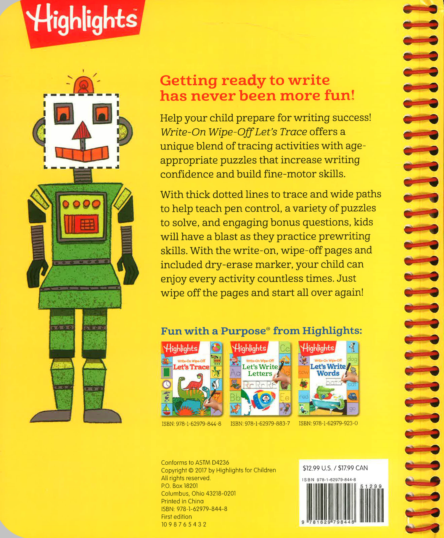 Tracing is an important step toward handwriting readiness, and Highlights infuses Fun with a Purpose™ into this activity. With vibrant art and fun prompts, Write-On Wipe-Off Let’s Trace progresses from simple and short lines to more complex, age-appropriate mazes and other puzzles. A variety of activities, including dot-to-dots and finish-the-drawing features, will engage and entertain kids and build their confidence as they practice skills essential to getting ready to write. Kids love that they can draw all over these books, and parents love that the write-on wipe-off format lets kids trace over and over again and again.