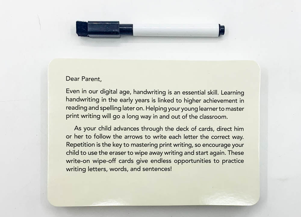 This Write-On Wipe-Off card deck features reusable surfaces so kids can easily practice their printing, wipe their work away, and start again! Having good handwriting is an important skill . . . even in our digital age. Using the included dry-erase pen, children will master upper- and lowercase letters, as well as words and sentences. And with 40 cards in the box, there's plenty of space for kids to write, which encourages repetition and success.