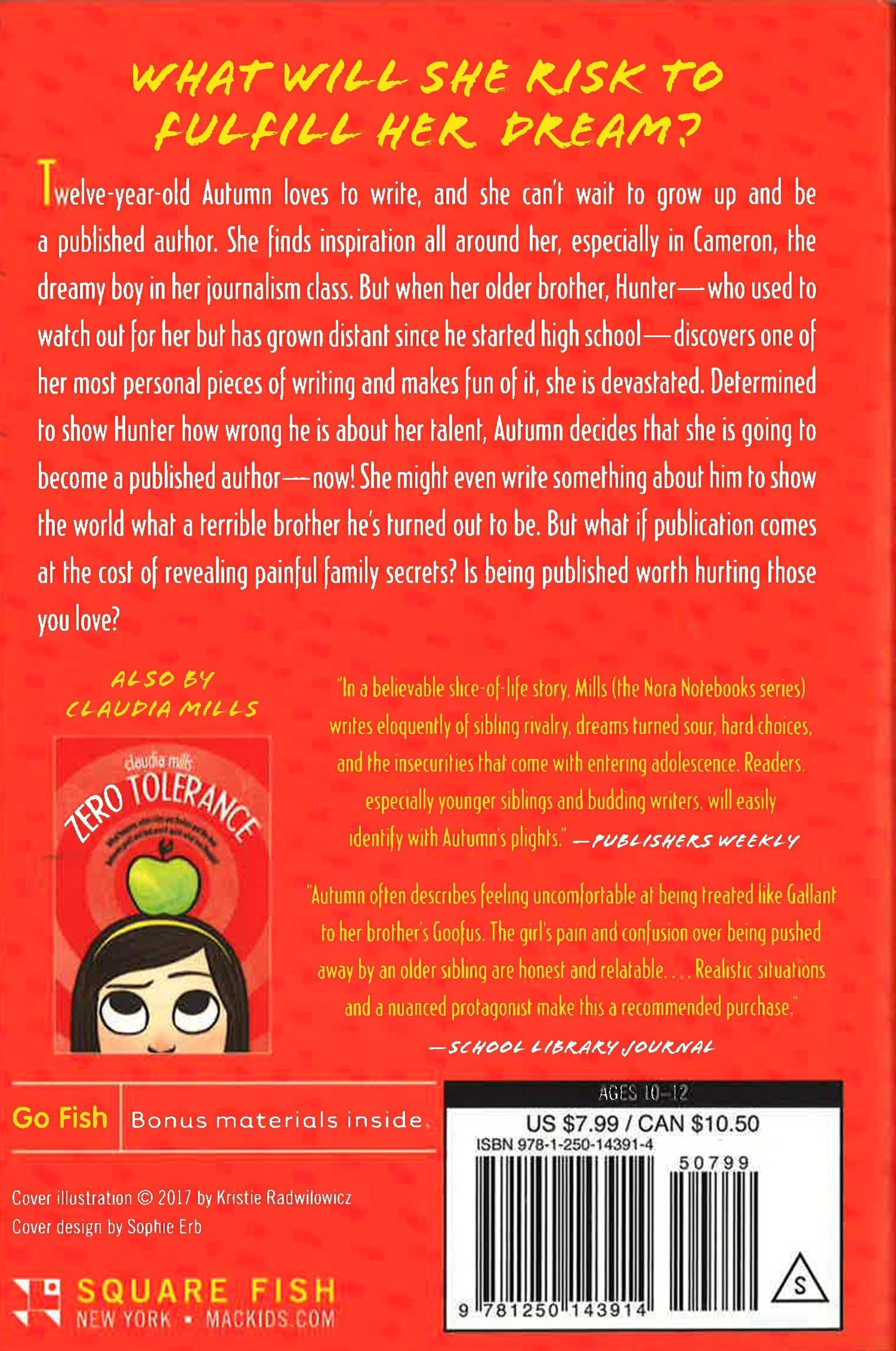 Twelve-year-old Autumn loves to write, and she can't wait to grow up and be a published author. She finds inspiration all around her, but especially in Cameron, the dreamy boy in her journalism class who she has a major crush on. When her older brother Hunter makes fun of one of her most personal poems - about Cameron - Autumn decides to prove that she is talented enough to become a published author.But when her essay about Hunter wins a contest, and her dream of being published is finally within reach, Autumn has to decide whether being a real writer is worth the cost of sharing her family's secrets and hurting people she loves.This touching story is sure to resonate with readers and prove that the heart is mightier than the pen. A great selection for preteens and aspiring writers.