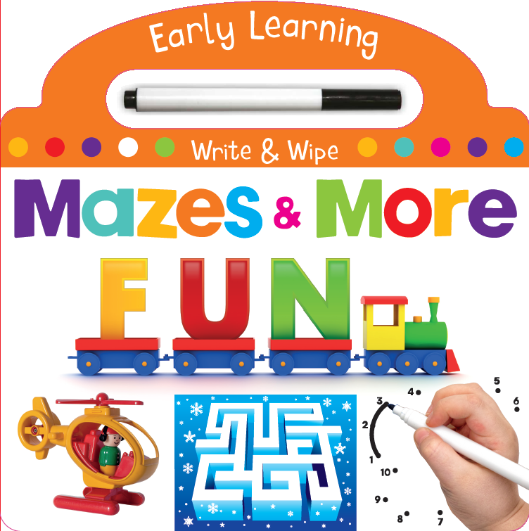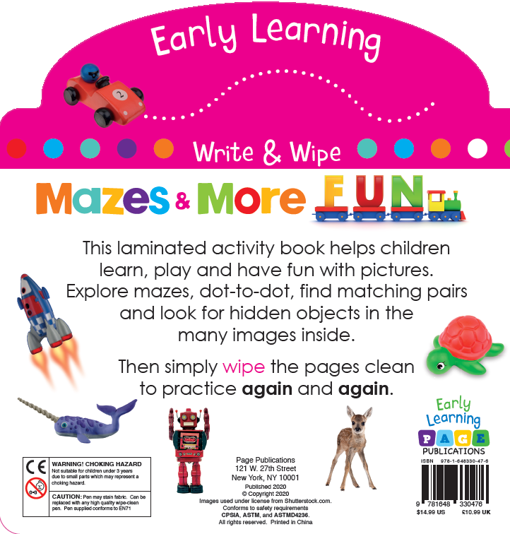 The laminated activity book helps children learn, play and have fun with pictures. Explore mazes, dot-to-dot, find matching pairs and look for hidden objects in the many images inside. Then simply wipe the pages clean to practice again and again.