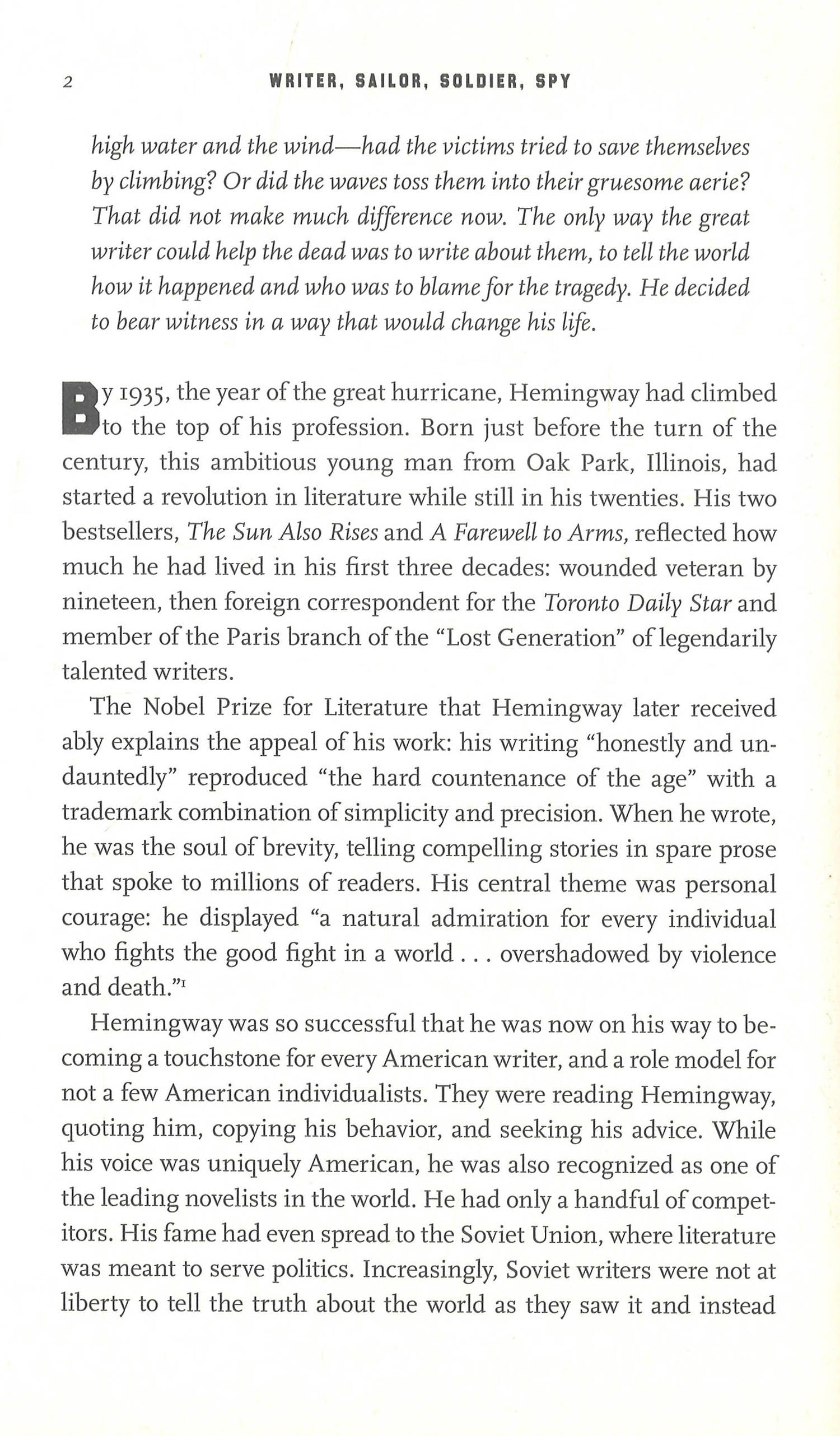 NEW YORK TIMES BESTSELLER * A "riveting"* international cloak-and-dagger epic, here is the stunning untold story of Ernest Hemingway's dangerous secret life -- including his role as a Soviet agent code-named "Argo" -- that fueled his art and his undoing. In 2010, while he was the historian at the esteemed CIA Museum, Nicholas Reynolds, a longtime American intelligence officer, former U.S. Marine colonel, and Oxford-trained historian, began to uncover clues suggesting Nobel Prize-winning novelist Ernest Hemingway was deeply involved in mid-twentieth-century spycraft -- a mysterious and shocking relationship that was far more complex, sustained, and fraught with risks than has ever been previously supposed. Now Reynolds's meticulously researched and captivating narrative, Writer, Sailor, Soldier, Spy, "looks among the shadows and finds a Hemingway not seen before" (London Review of Books), revealing for the first time the whole story of this hidden side of Hemingway's life: his troubling recruitment by Soviet spies to work with the NKVD, the forerunner to the KGB, followed in short order by a complex set of secret relationships with American agencies, including the FBI, the Department of State, the Office of Naval Intelligence (ONI), and the Office of Strategic Services (OSS), a precursor to the CIA. Starting with Hemingway's sympathy to antifascist forces during the 1930s, Reynolds illuminates Hemingway's immersion in the life-and-death world of the revolutionary left, from his passionate commitment to the Spanish Republic; his successful pursuit by Soviet NKVD agents, who valued Hemingway's influence, access, and mobility; his wartime meeting in East Asia with communist leader Chou En-Lai, the future premier of the People's Republic of China; and finally to his undercover involvement with Cuban rebels in the late 1950s and his sympathy for Fidel Castro. Reynolds equally explores Hemingway's participation in various roles as an agent for the United States government, including hunting Nazi submarines with ONI-supplied munitions in the Caribbean on his boat, Pilar; his command of an informant ring in Cuba called the "Crook Factory" that reported to the American embassy in Havana; and his on-the-ground role in Europe, where he helped OSS gain key tactical intelligence for the liberation of Paris and fought alongside the U.S. infantry in the bloody endgame of World War II. As he examines the links between Hemingway's work as an operative and as an author, Reynolds reveals how Hemingway's secret adventures influenced his literary output and contributed to the writer's block and mental decline (including paranoia) that plagued him during the postwar years -- a period marked by the Red Scare and McCarthy hearings, which destroyed the life of anyone with Soviet connections. Reynolds also illuminates how those same experiences played a role in some of Hemingway's greatest works, including For Whom the Bell Tolls and The Old Man and the Sea, while also adding to the burden that he carried at the end of his life and perhaps contributing to his suicide. A literary biography with the soul of an espionage thriller, Writer, Sailor, Soldier, Spy is an essential contribution to our understanding of the life, work, and fate of one of America's most legendary authors. *William Doyle