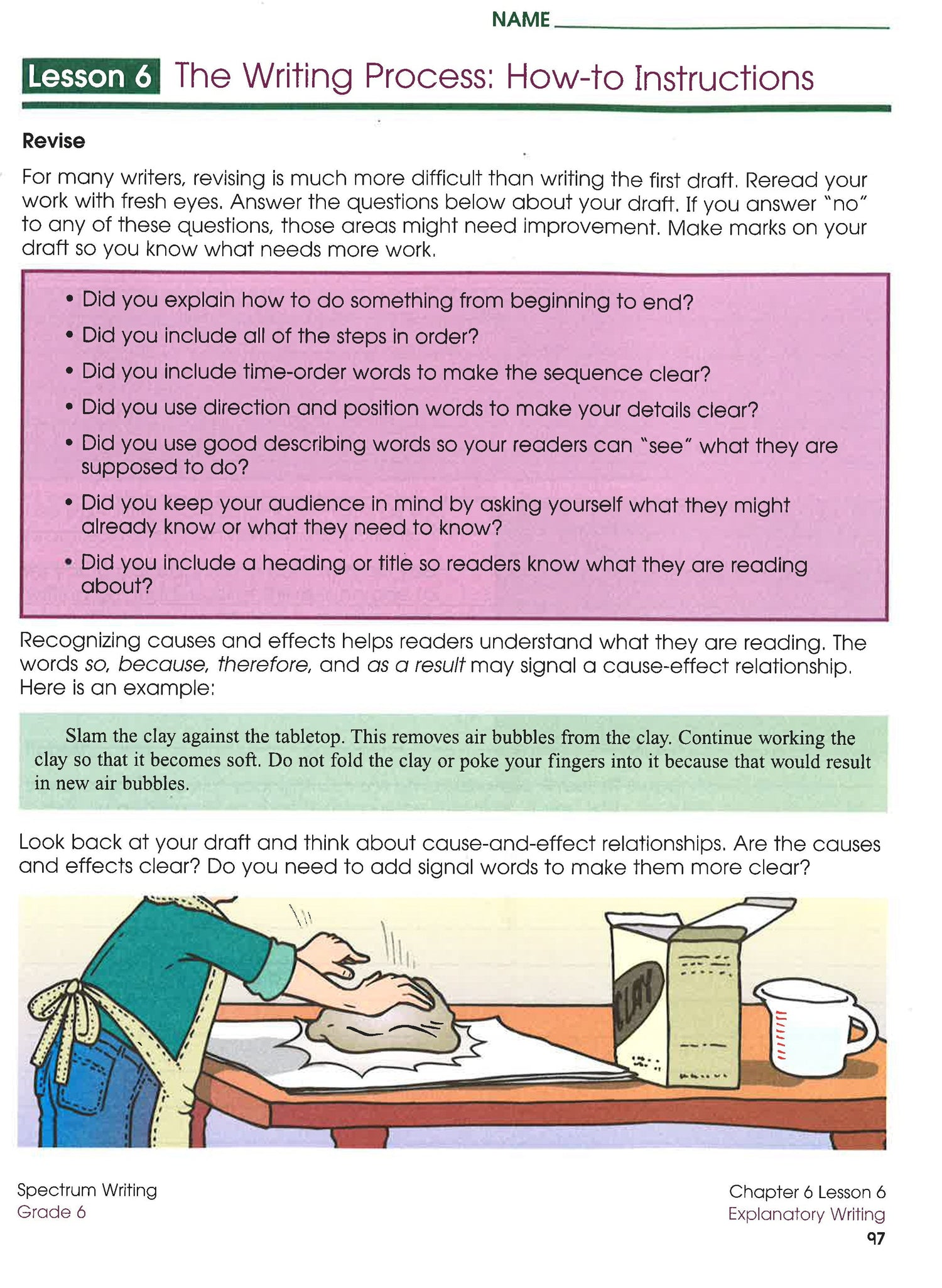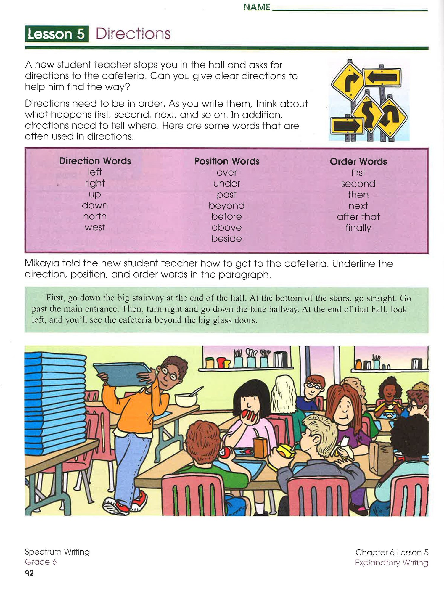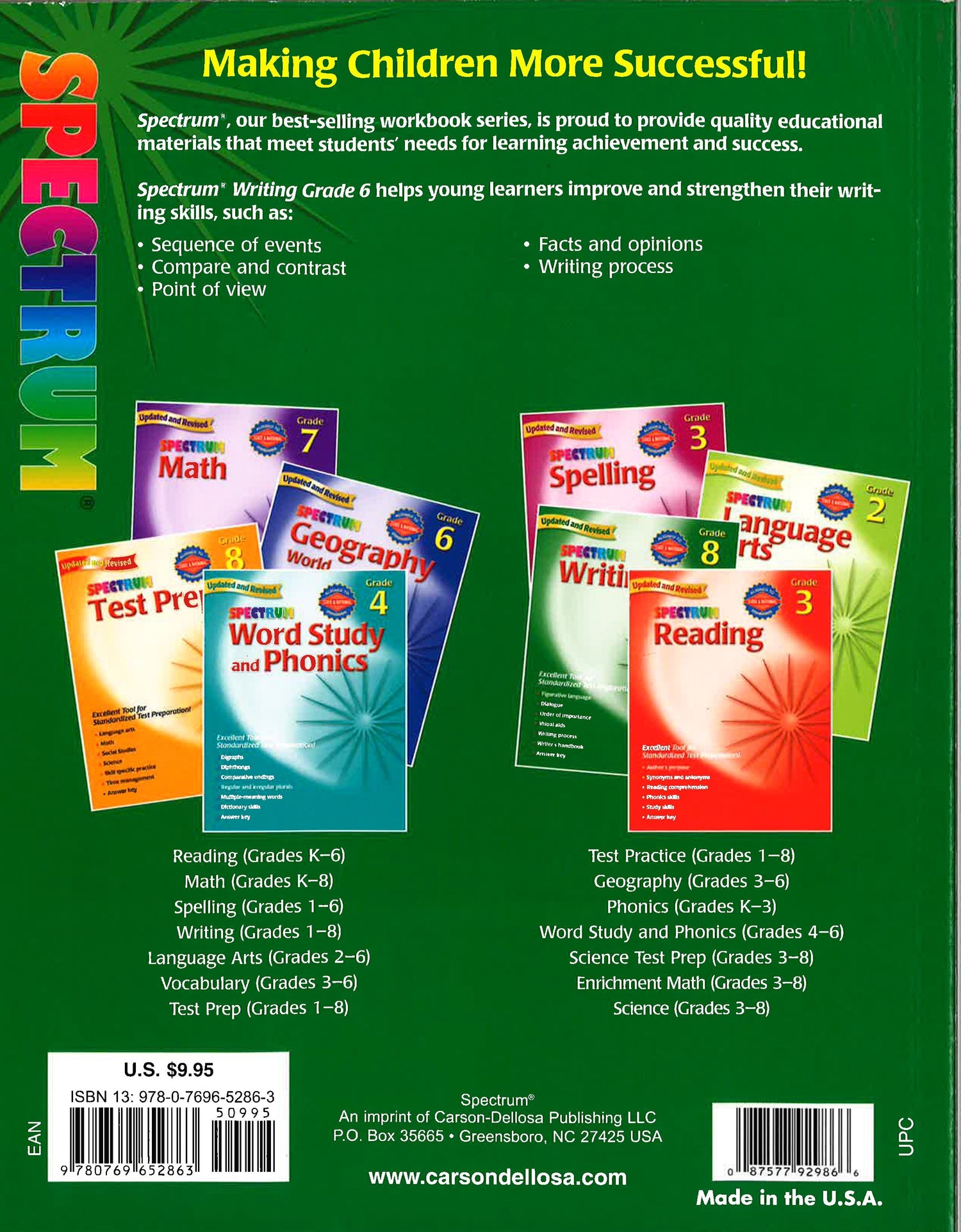 Spectrum Writing creates student interest and sparks writing creativity! The lessons, perfect for students in grade 6, strengthen writing skills by focusing on sequence of events, comparing and contrasting, point of view, facts and opinions, and more! Each book provides an overview of the writing process, as well as a break down of the essential skills that build good writing. It features easy-to-understand directions, is aligned to national and state standards, and also includes a complete answer key. --Today, more than ever, students need to be equipped with the essential skills they need for school achievement and for success on proficiency tests. The Spectrum series has been designed to prepare students with these skills and to enhance student achievement. Developed by experts in the field of education, each title in the Spectrum workbook series offers grade-appropriate instruction and reinforcement in an effective sequence for learning success. Perfect for use at home or in school, and a favorite of parents, homeschoolers, and teachers worldwide, Spectrum is the learning partner students need for complete achievement.