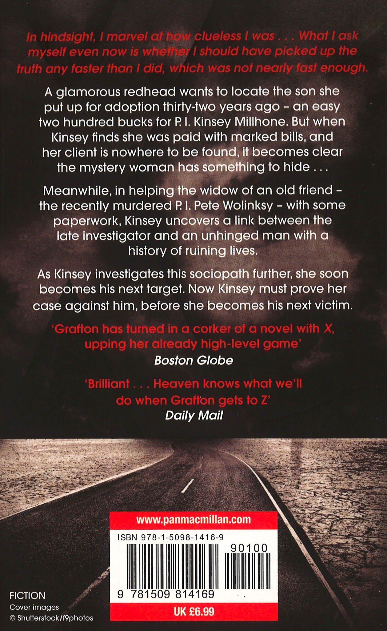 X is the New York Times number 1 bestseller and thrilling, twenty-fourth book in the Kinsey Millhone Alphabet series from Sue Grafton.In hindsight, I marvel at how clueless I was . . . What I ask myself even now is whether I should have picked up the truth any faster than I did, which is to say not fast enough . . .When a glamorous red head wishes to locate the son she put up for adoption thirty-two years ago, it seems like an easy two hundred bucks for private investigator Kinsey Millhone. But when a cop tells her she was paid with marked bills, and Kinsey's client is nowhere to be found, it becomes apparent this mystery woman has something to hide. Riled, Kinsey won't stop until she's found out who fooled her and why.Meanwhile, the widow of the recently murdered P. I. - and Kinsey's old friend - Pete Wolinsky, needs help with her IRS audit. This seemingly innocuous task takes a treacherous turn when Kinsey finds a coded list amongst her friend's files. It soon leads her to an unhinged man with a catalogue of ruined lives left in his wake. And despite the devastation, there isn't a single conviction to his name. It seems this sociopath knows exactly how to cause chaos without leaving a trace.As Kinsey delves deeper into the investigation she quickly becomes the next target of this tormentor. But can Kinsey prove her case against him before she becomes the next victim?