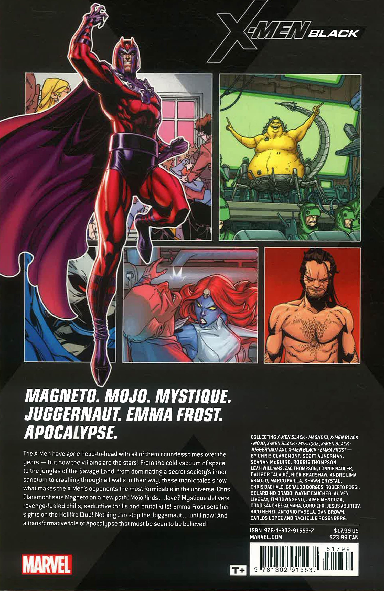 Collects X-Men Black - Magneto, X-Men Black - Mojo, X-Men Black - Mystique, X-Men Black - Juggernaut And X-Men Blac - Emma Frost. Magneto. Mojo. Mystique. Juggernaut. Emma Frost. Apocalypse. The X-Men have gone head-to-head with all of them countless times over the years - but now the villains are the stars! From the cold vacuum of space to the jungles of the Savage Land, from dominating a secret society's inner sanctum to crashing through all walls in their way, these titanic tales show what makes the X-Men's opponents the most formidable in the universe. Chris Claremont sets Magneto on a new path! Mojo finds...love? Mystique delivers revenge-fueled chills, seductive thrills and brutal kills! Emma Frost sets her sights on the Hellfire Club! Nothing can stop the Juggernaut...until now! And a transformative tale of Apocalypse that must be seen to be believed!