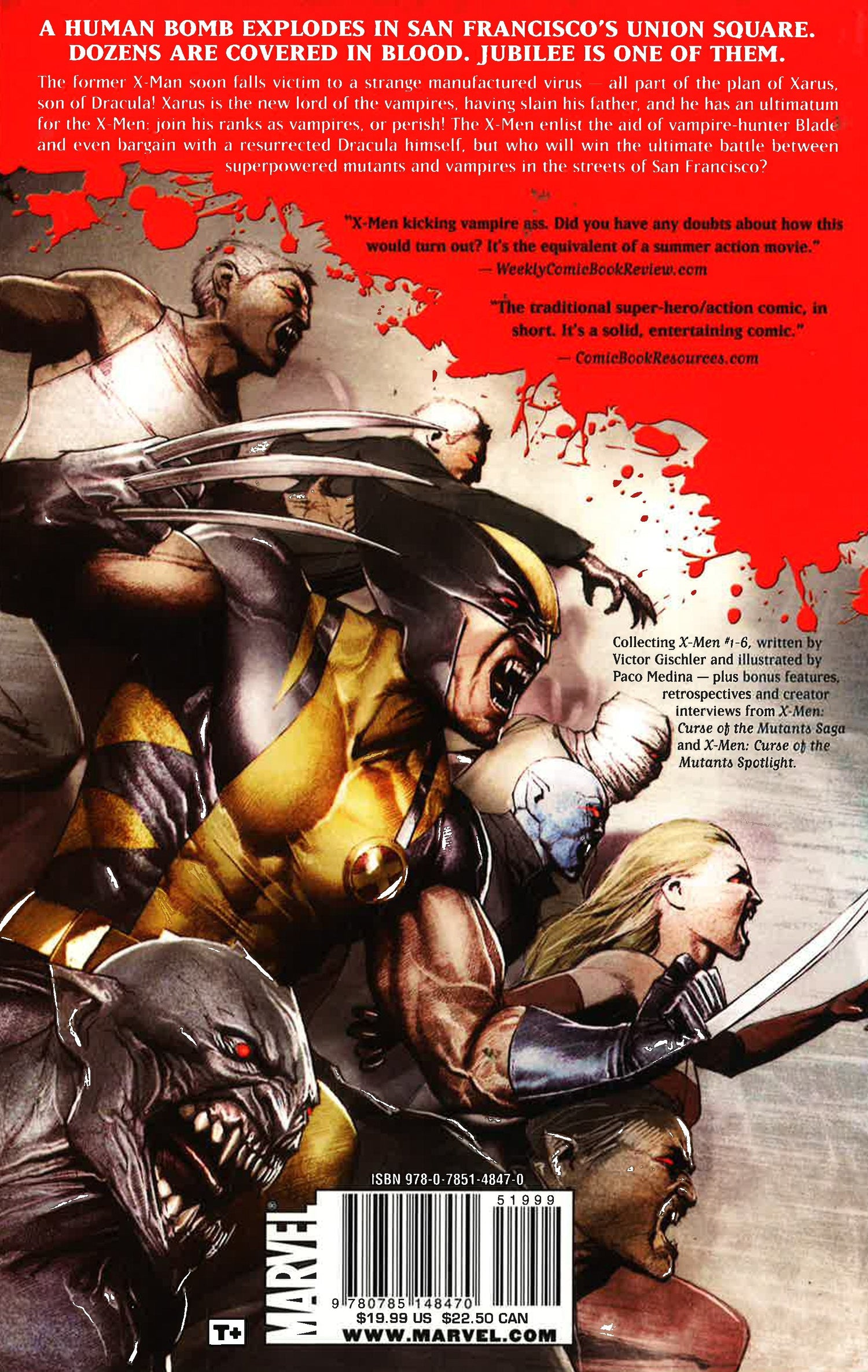 A human bomb explodes in San Francisco's Union Square. Dozens are covered in blood. Jubilee is one of them. The former X-Man soon falls victim to a strange manufactured virus - all part of the plan of Xarus, son of Dracula! Xarus is the new lord of the vampires, having slain his father, and he has an ultimatum for the X-Men: join his ranks as vampires, or perish! The X-Men enlist the aid of vampire-hunter Blade and even bargain with a resurrected Dracula himself, but who will win the ultimate battle between mutants and vampires in the streets of San Francisco?