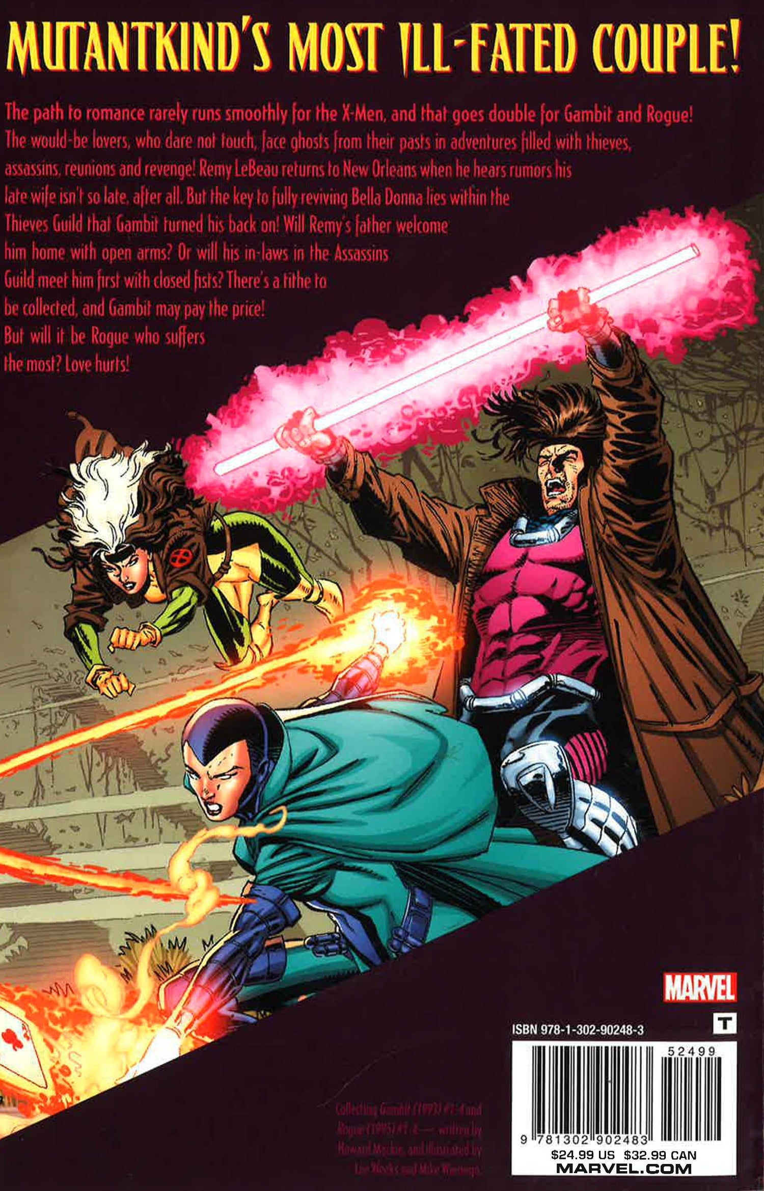 The path of romance rarely runs smoothly for the X-Men, and that goes double for mutantkind's most ill-fated couple: Gambit and Rogue! The would-be lovers who dare not touch face ghosts from their pasts in adventures filled with thieves, assassins, reunions and revenge! Remy LeBeau returns to New Orleans when he hears rumors his late wife isn't so late after all. But the key to fully reviving Bella Donna lies within the Thieves Guild that Gambit turned his back on! Will Remy's father welcome him home with open arms? Or will his in-laws in the Assassins Guild meet him first with closed fists