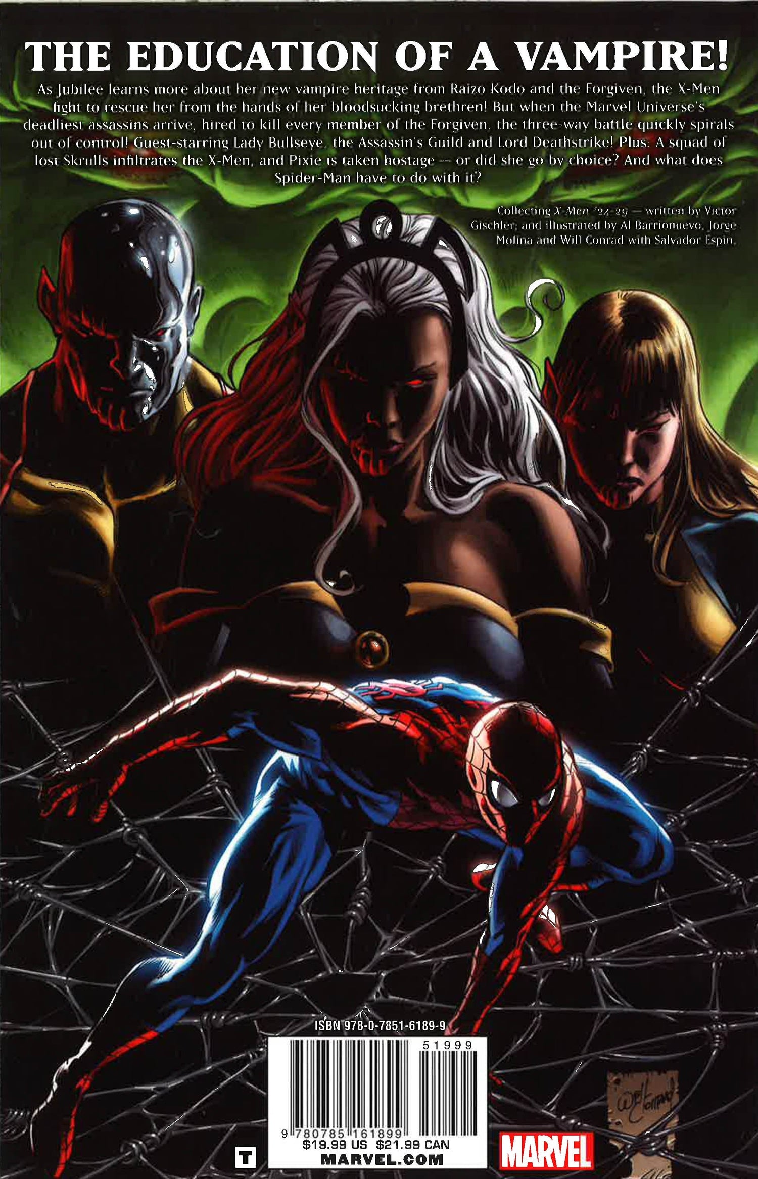 As Jubilee learns more about her new vampire heritage from Raizo Kodo and the Forgiven, the X-Men fight to rescue Jubilee from the hands of her bloodsucking brethren! But when the Marvel Universe's deadliest assassins arrive, hired to kill every member of the Forgiven, the three-way battle quickly spirals out of control! Guest-starring Lady Bullseye, the Assassin's Guild and Lord Deathstrike! Plus: A squad of lost Skrulls infiltrates the X-Men, and Pixie is taken hostage - or did she go by choice? Collecting X-MEN (2010) #24-29.