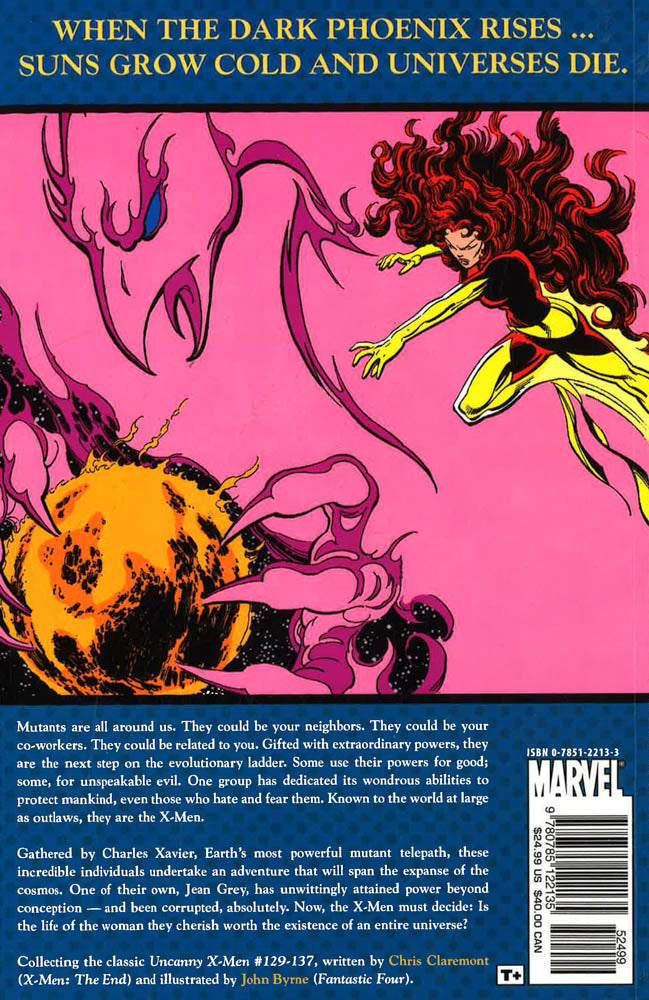 Gathered together by Professor Charles Xavier to protect a world that fears and hates them, the X-Men had fought many battles, been on adventures that spanned galaxies, grappled enemies of limitless might, but none of this could prepare them for the most shocking struggle they would ever face. One of their own members, Jean Grey, has gained power beyond all comprehension, and that power has corrupted her absolutely! Now they must decide if the life of the woman they cherish is worth the existence of the entire universe! Collects X-Men #129-137.