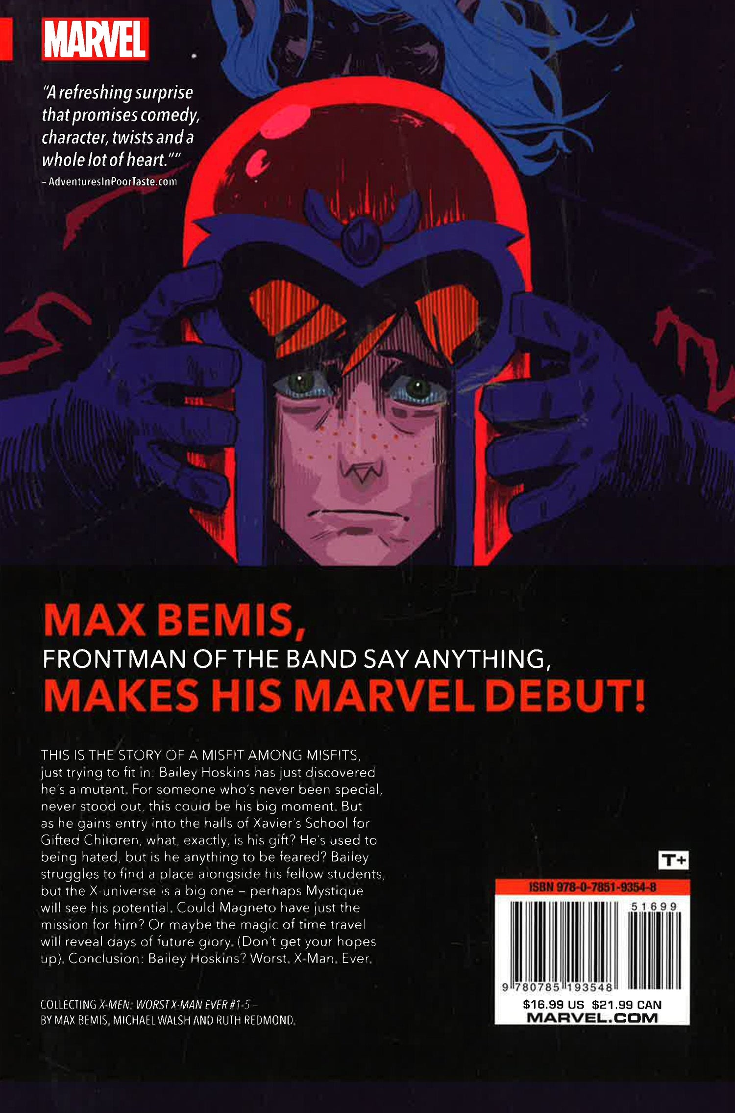 Bailey Hoskins has just discovered that he's a mutant. For someone who's never been special, never stood out, this could be his big moment. But as he gains entry into the halls of Xavier's School for Gifted Children, what exactly is his gift? He's used to being hated, but is he anything to be feared? Bailey struggles to find a place alongside his fellow students, but the X-Universe is a big one - perhaps Mystique will see his potential. Or could Magneto have just the mission for him? Max Bemis, front man of the band Say Anything, makes his Marvel debut with the story of a misfit among misfits, just trying to fit in. Bailey Hoskins? Worst. X-Man. Ever. COLLECTING: X-MEN: WORST X-MAN EVER 1-5
