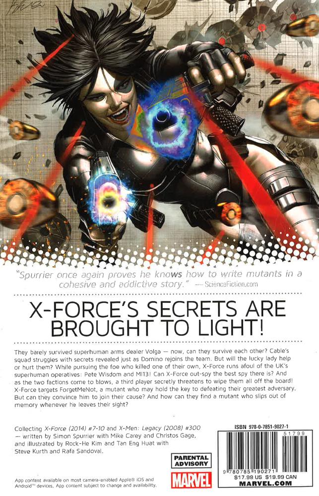 X-Force barely survived the superhuman arms dealer Volga - and with their secrets brought to light, they're barely surviving each other. How will Cable's team keep it together to carry out their mission? Will Domino's return help or hurt them? While pursuing the foe who killed one of their own, X-Force runs afoul of the UK's superhuman operatives: Pete Wisdom and MI13! Can X-Force out-spy the best spy there is? As the two factions come to blows, a third player secretly threatens to wipe them all off the board! X-Force targets ForgetMeNot, a mutant who may hold the key to defeating their greatest adversary!