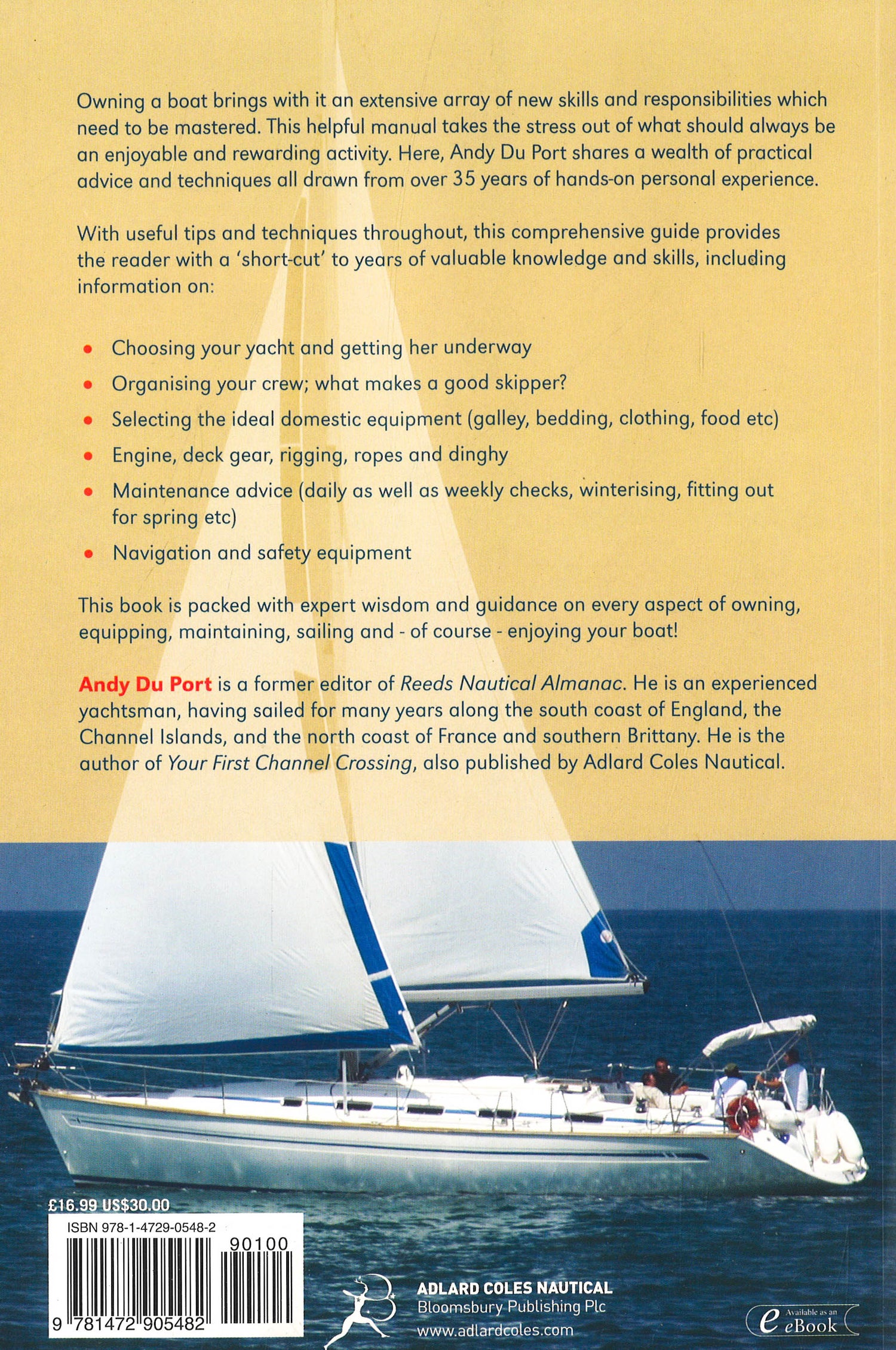 Drawn from more than thirty-five years of the author’s own experiences, this book is packed with expert wisdom and hand-holding guidance on every aspect of owning, equipping, maintaining, sailing, and - of course - enjoying your first boat. Topics covered include: choice of boat; insurance; assessing (and costing) moorings and berths; navigation and safety equipment; domestic equipment (galley, bedding, clothing, etc); navigation (including in fog); maneuvering in close spaces; sources of weather information and forecasts; responsibilities towards crew; catering and cooking; maintenance advice (daily tips, winterizing, engine servicing, fitting out for spring, etc.); paperwork (including customs forms); dealing with emergencies; and more. Filled with color photos and diagrams throughout, this comprehensive guide is indispensable for new skippers who have learned to sail at a sailing school or on a friend’s boat and are ready to take the next step.