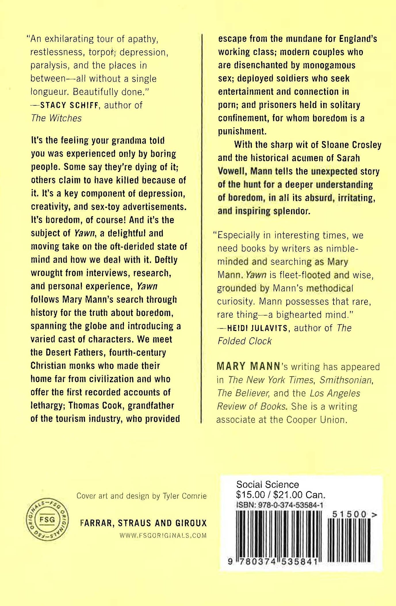 With sharp wit and impressive historical acumen, Mary Mann tells the unexpected story of the hunt for a deeper understanding of boredom, in all its absurd, irritating, and inspiring splendor. Deftly wrought from interviews, research, and personal experience, Yawn follows Mann?s search through history for the truth about boredom, spanning the globe and introducing a varied cast of characters.We meet the Desert Fathers, fourth-century Christian monks who made their homes far from civilization and who offer the first recorded accounts of lethargy; Thomas Cook, grandfather of the tourism industry, who provided escape from the mundane for England?s working class; modern couples who are disenchanted by monogamous sex, deployed soldiers who seek entertainment and connection in porn; and prisoners held in solitary confinement, for whom boredom is a punishment.