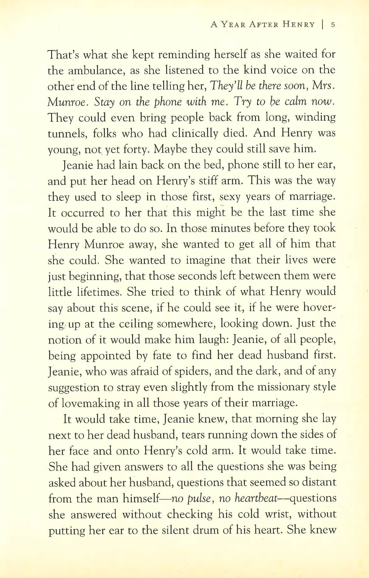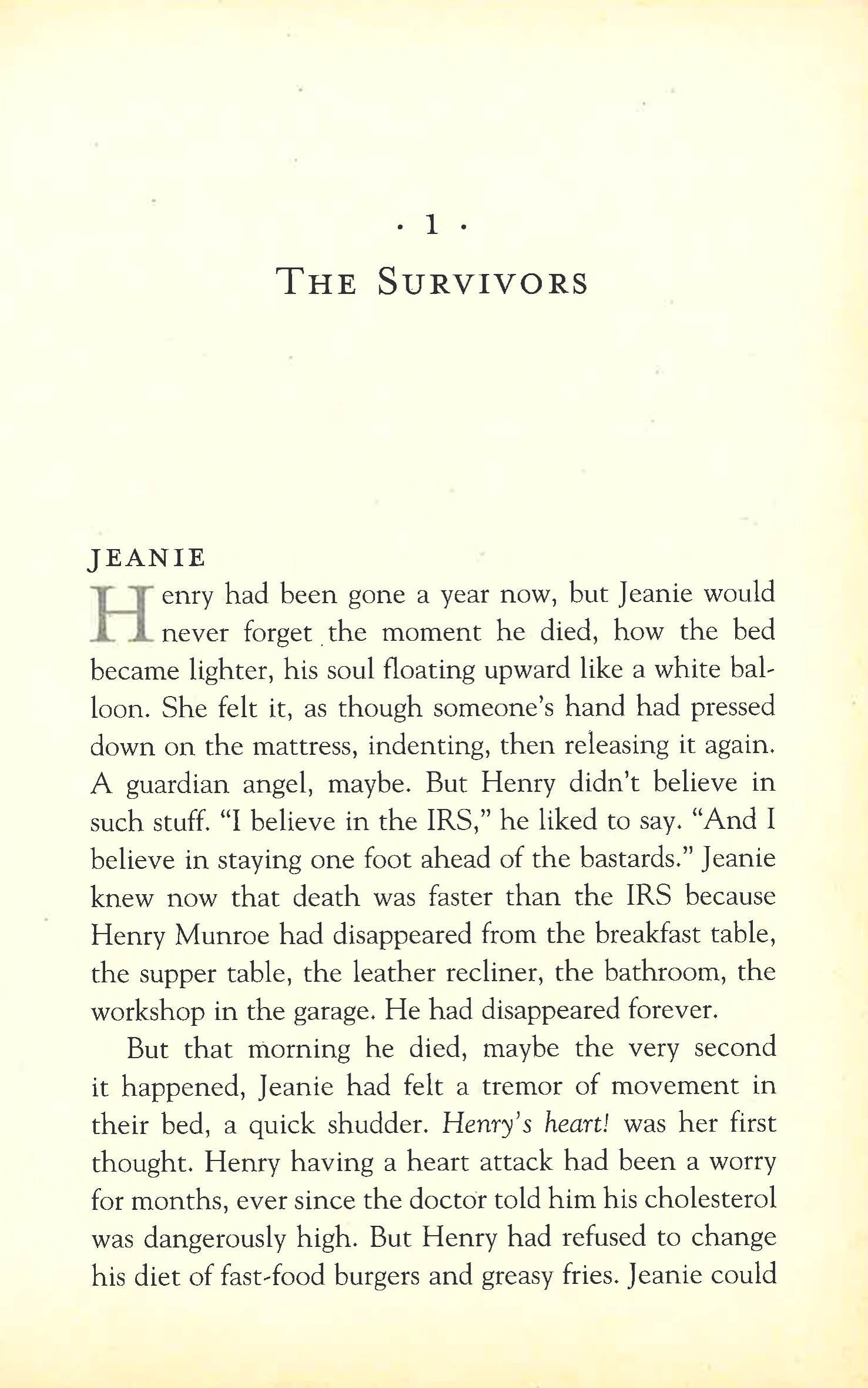 Bixley, Maine. One year after Henry Munroe's fatal heart attack at age forty-one, his doting parents, prudish wife, rebellious son, and wayward brother are still reeling. So is Evie Cooper, a bartender, self-proclaimed "spiritual portraitist," and Henry's former mistress. While his widow, Jeanie, struggles with the betrayal, Henry's overbearing mother is making plans to hold a memorial service. As the date of the tribute draws closer and these worlds threaten to collide, the Munroes grapple with the frailty of their own lives and the knowledge that love is all that matters.