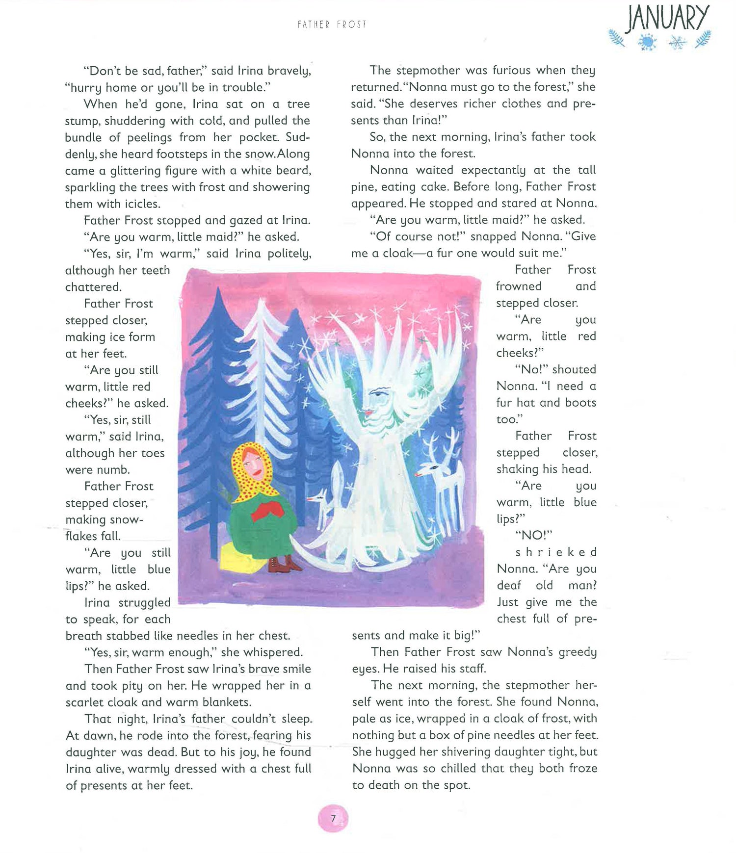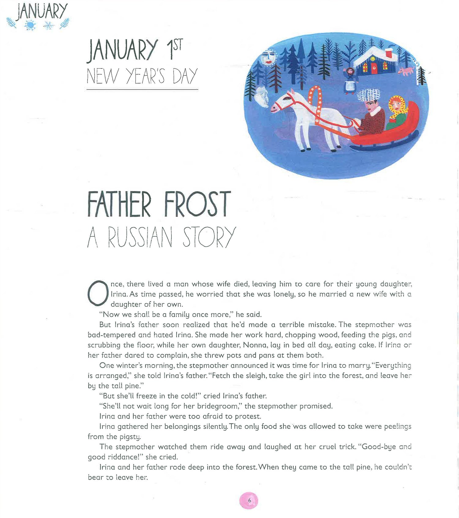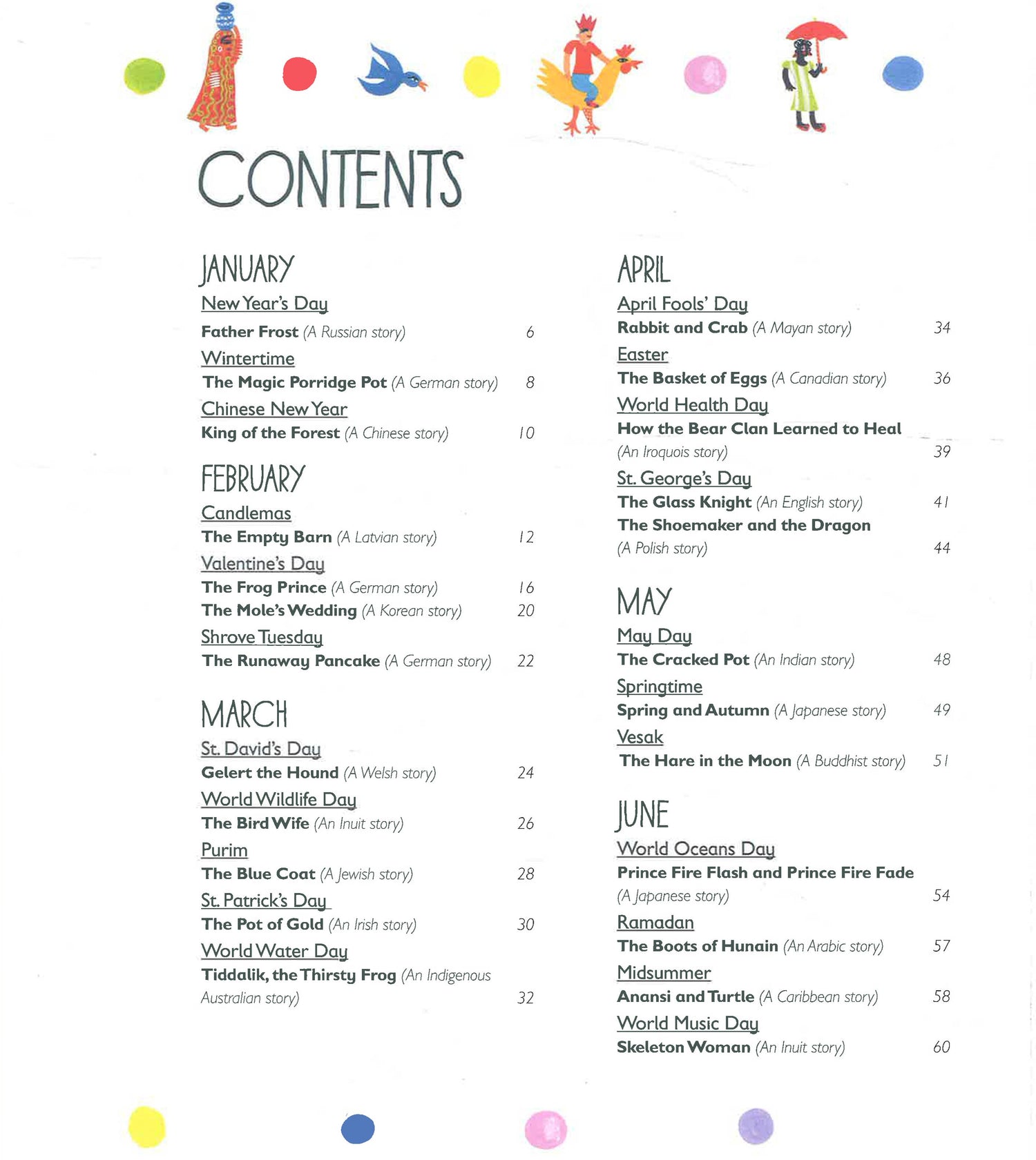 The book is divided into 12 chapters, one for each month of the year, and throughout, stories are matched to internationally celebrated dates, including St. Patrick’s Day and the International Day of Friendship, as well as seasonal events and festivals.