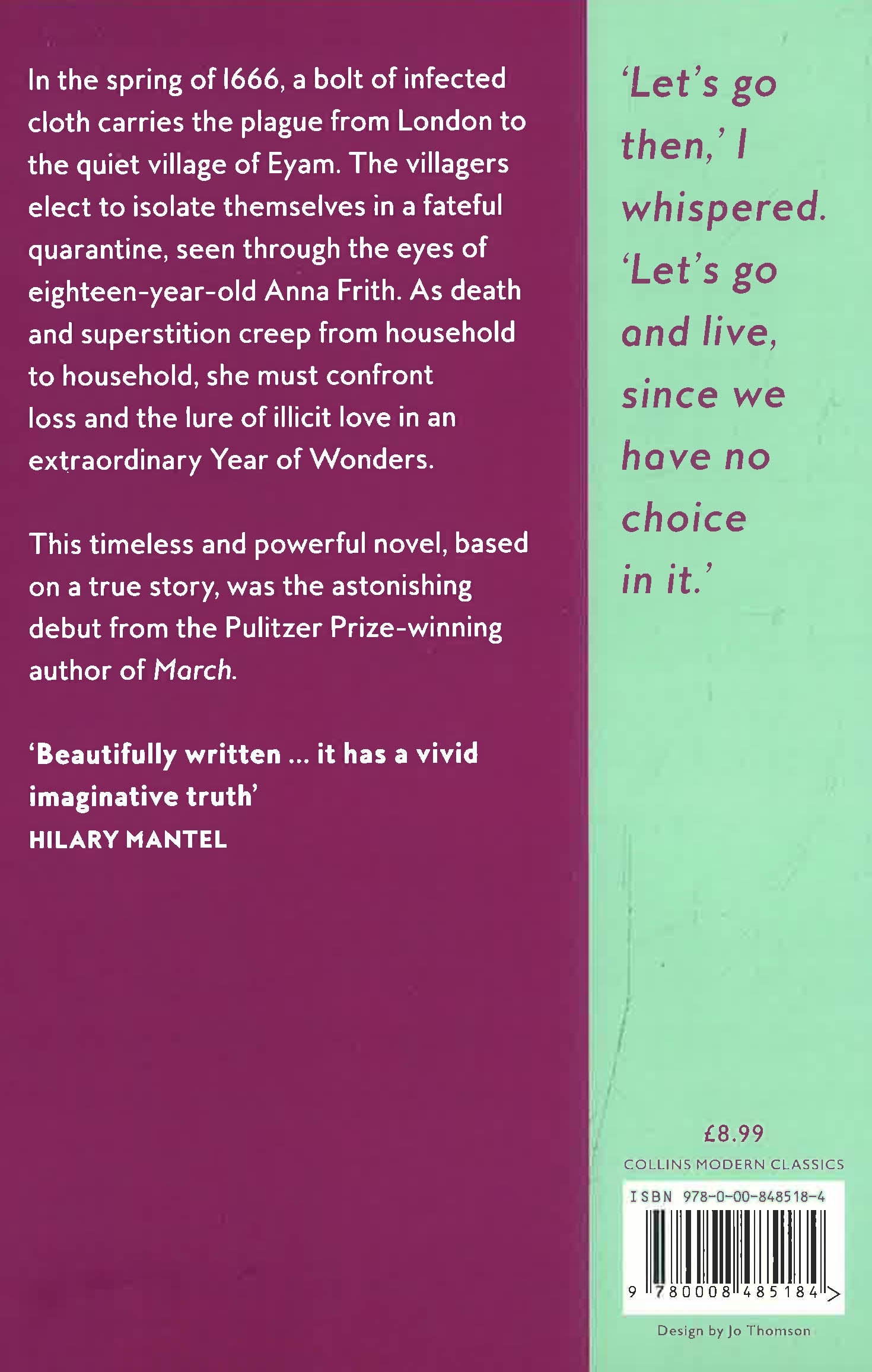 In the spring of 1666, a bolt of infected cloth carries the plague from London to the quiet village of Eyam. The villagers elect to isolate themselves in a fateful quarantine, seen through the eyes of eighteen-year-old Anna Frith. As death and superstition creep from household to household, she must confront loss and the lure of illicit love in an extraordinary Year of Wonders.