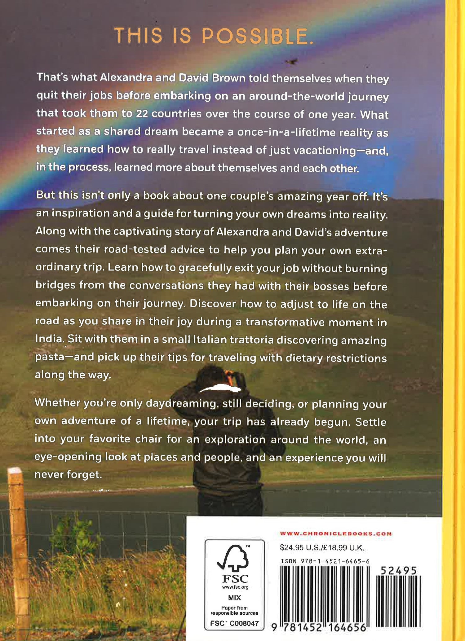 A Year Off is one part travel guide, one part travel essays and photos, and one part memoir documenting the story of Alexandra and David Brown, a couple who decided to take a year off from their jobs and 'regular lives' to travel the world together after only knowing each other for a few months. With many gorgeous photographs and actionable travel advice, A Year Off captures all the beauty and magic of the wanderlust spirit, guiding readers on how to take the same leap and showing them just how doable a journey this type of round-the-world travel is. Each chapter provides perspectives from both authors and tackles a different part of the journey, including: