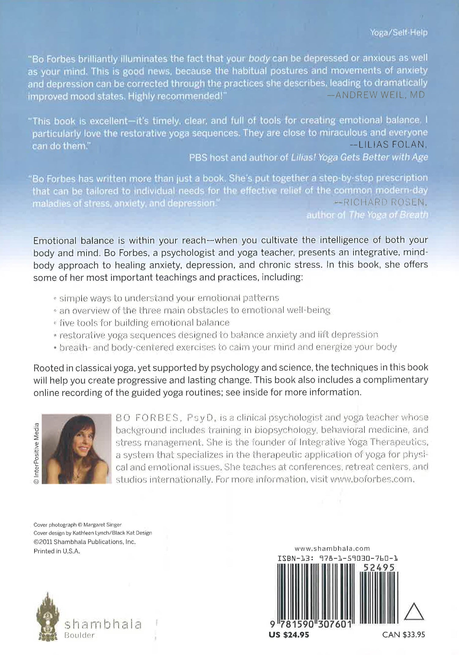 Bo Forbes, a psychologist and yoga teacher, offers some of her most important teachings and practices, including:
